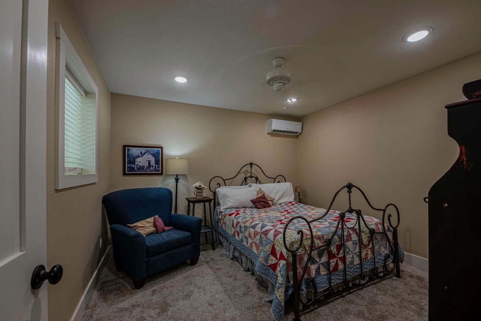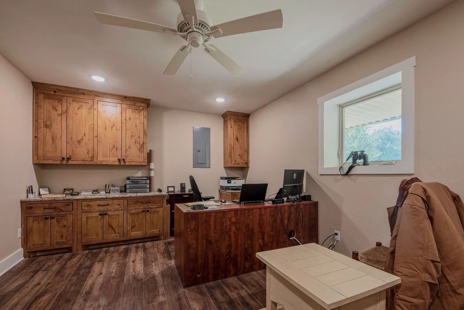 The bunkhouse is an addition incorporated into the shop and completed in the fall of 2023. It has 1440 square feet of living space on two levels consisting of 3 bedrooms with 3 baths (with tiled walk-in showers), 2 common rooms on each level and an office on the 1st floor. The living space is air conditioned with two mini split all electric heat pumps with a/c heads in each room for independent temperature control.