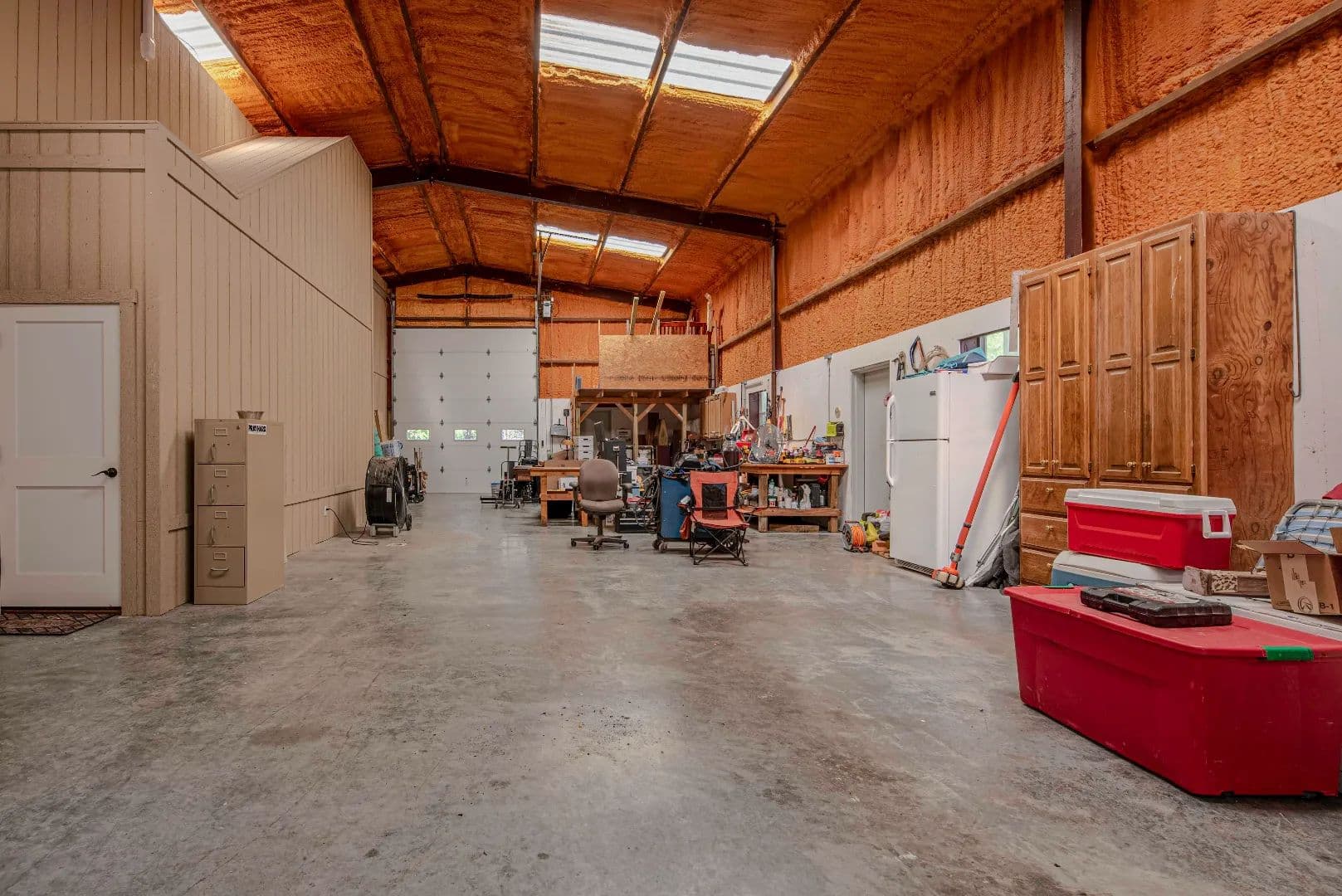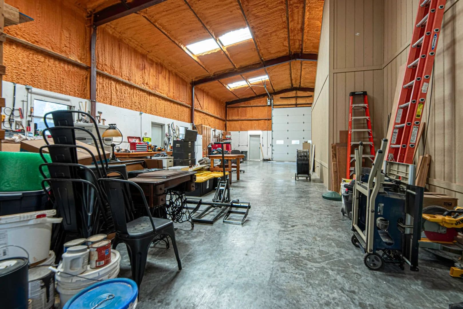 There is a large metal shop (40’x60’) with a wall height of 17’ sitting on a commercial grade concrete floor. Walls and ceiling have closed cell spray foam insulation. There are three entry doors at each end in the middle. There are two electrically operated, insulated overhead doors (12’ wide by 13’ tall) at each end of the building. A 12’ wide x 14’ high shed roof runs along the entire length of the NE side of the building. The shop comes with a large worktable, a stationary 60-gallon air compressor and a 220 volt plug for a welder.