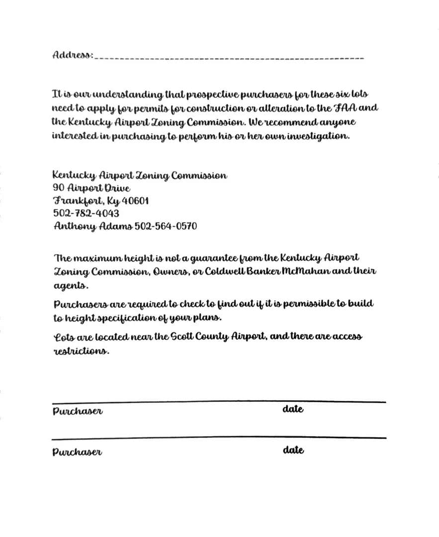 This 5 acres is ready to build your dream home. The successful buyer will need to get their house plans approved by the Kentucky Airport Zoning Board in Frankfort for the height restrictions. Purchasers are required to check to find out if it is permissible to build to height specifications of your plans. The lot is near the Scott County Airport and there are access restrictions. The Kentucky Airport Zoning Board is 502-782-4043 There is no HOA and attached are the Hyde Park Subdivision Protective Covenants.