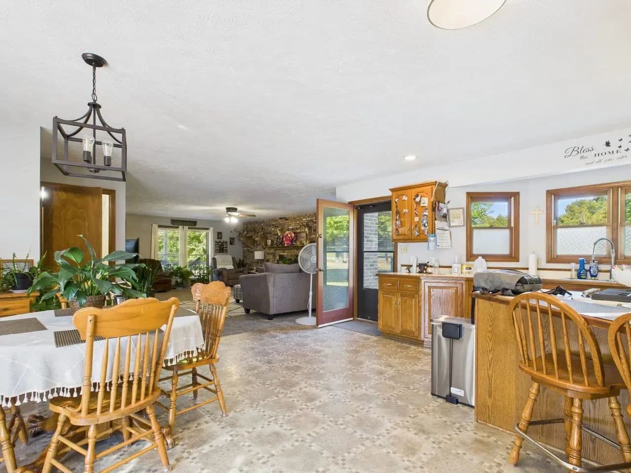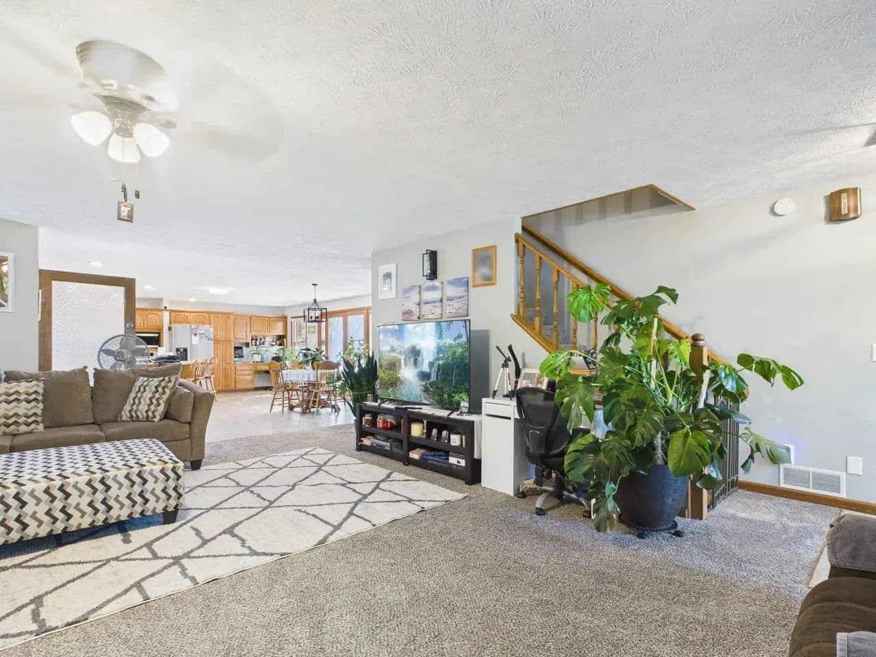 Open concept living room and large kitchen with an island, ideal for family gatherings