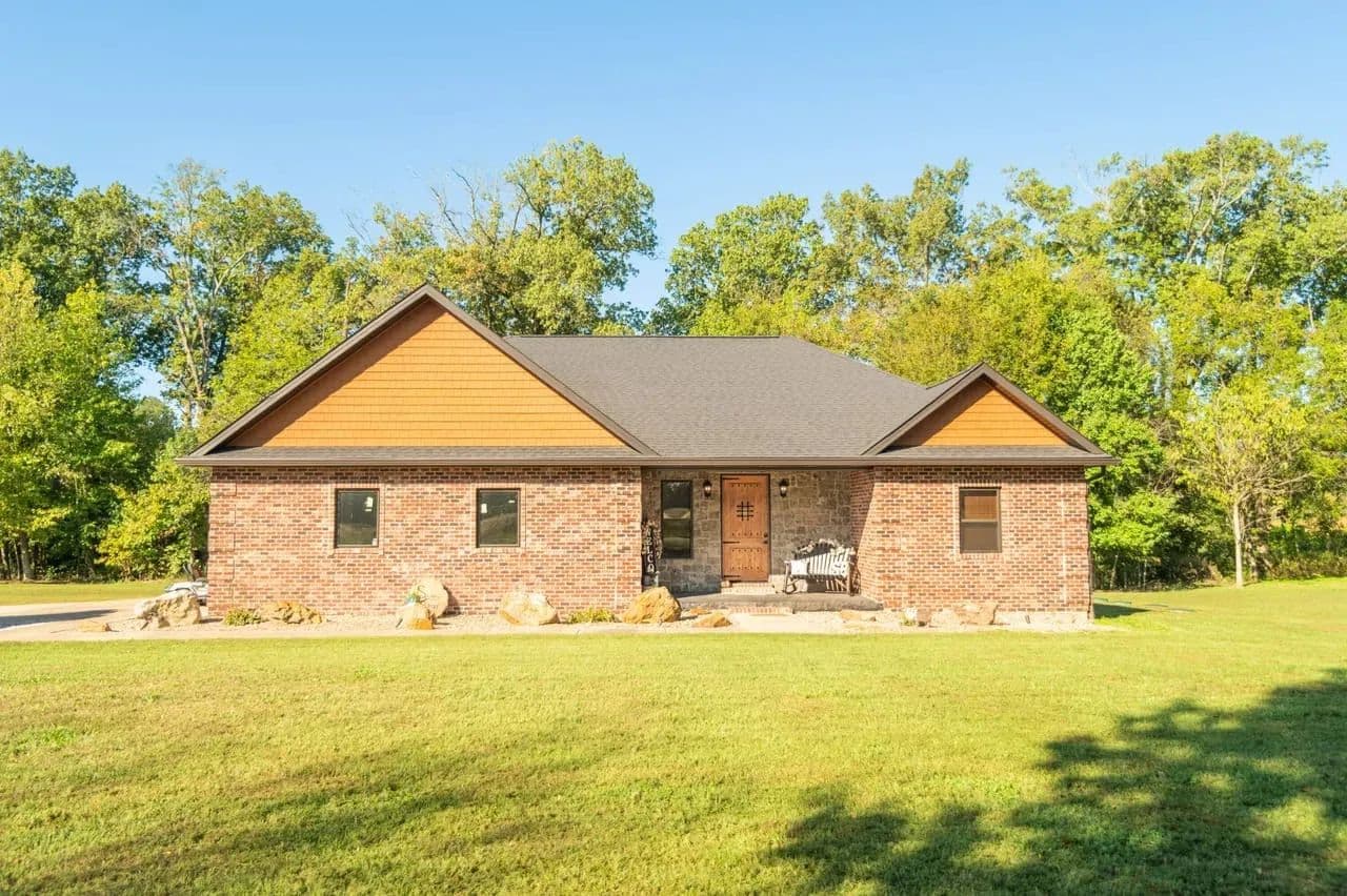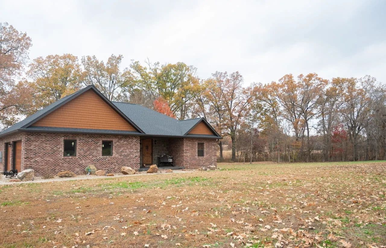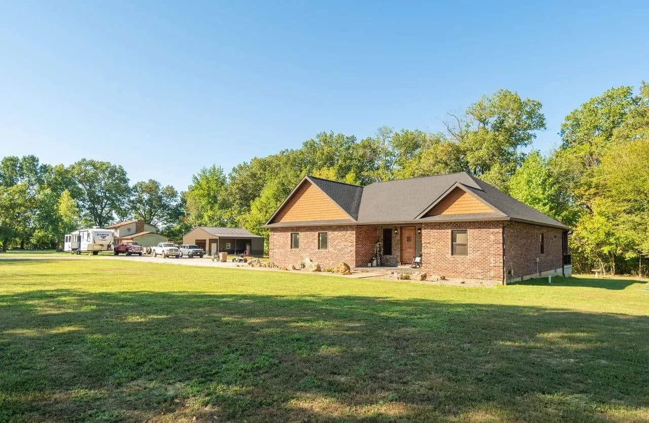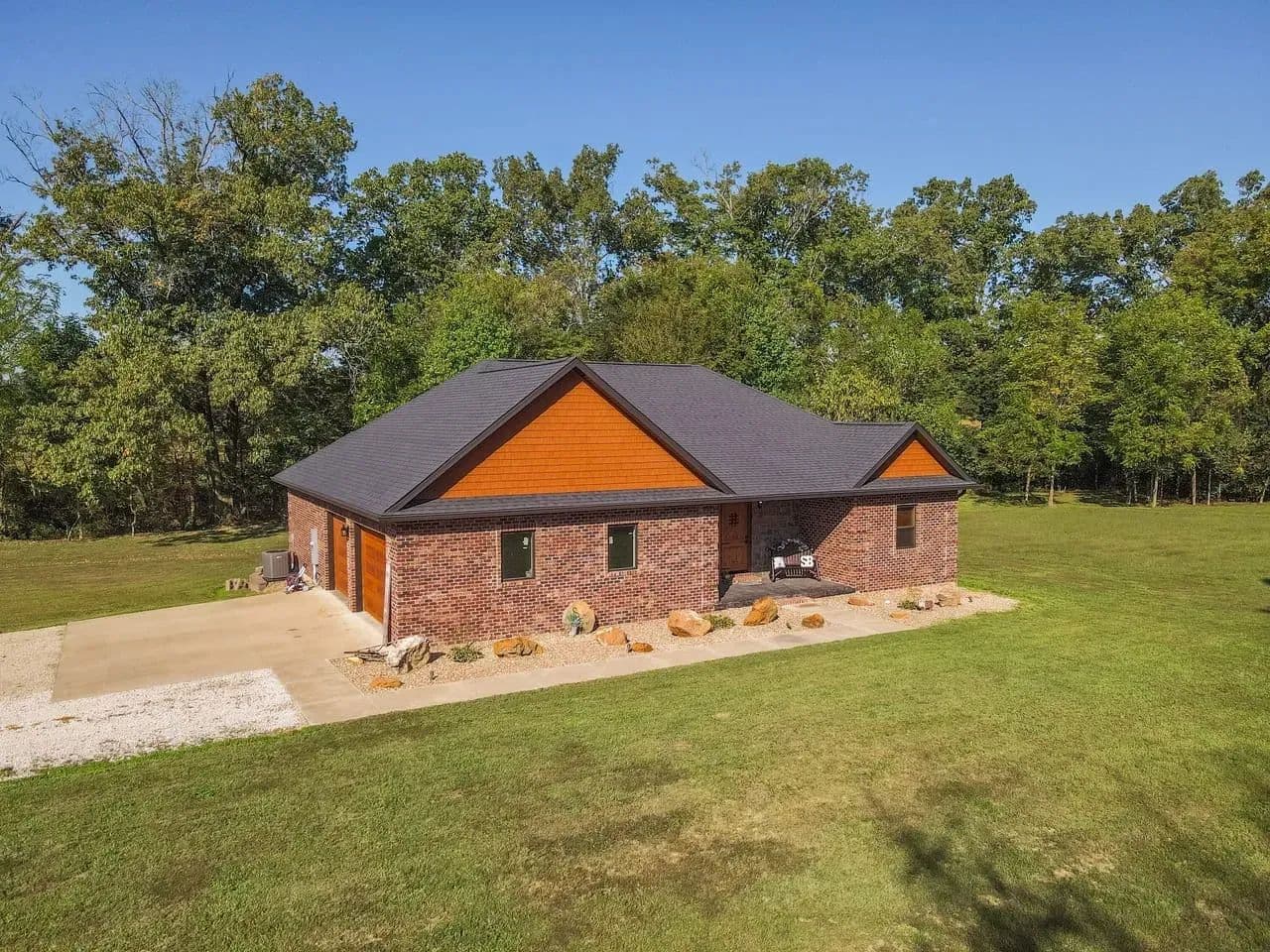 Custom brick and stone home on nearly 3 acres offering high-end finishes and rustic charm. Inside, the gourmet kitchen features Cambria quartz countertops, a copper farmhouse sink, maple-glazed cabinets, ledgestone pillars, and a full KitchenAid appliance suite. The home features two master suites, each with a cedar-framed bed, a walk-in closet, and hardwood floors. A spacious third bedroom, currently used as a study, and a versatile bonus room, ideal for storage or a nursery, provide additional flexibility. Both master suite bathrooms are beautifully finished with custom cabinetry, stone sinks, quartz countertops, and tiled showers. The living room offers a warm, rustic feel with a custom stone fireplace wrapped in cedar, vaulted ceilings with custom beams, and a knotty alder front door. Enjoy the outdoors with concrete front and back porches, a 30x30 shop with a 10x30 overhang, and an oversized two-car garage. Quality craftsmanship and thoughtful design make this home a standout property in a peaceful country setting.
