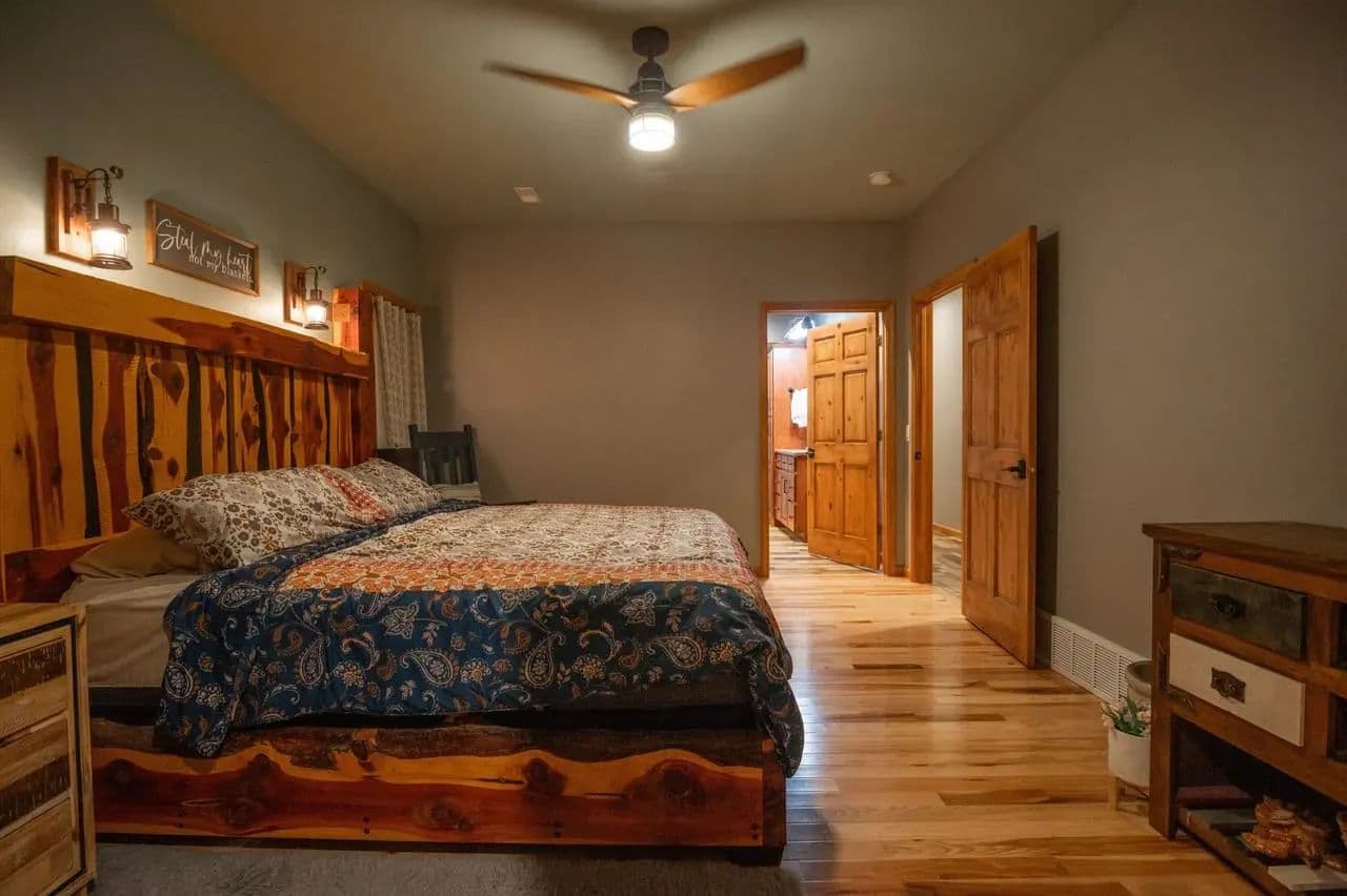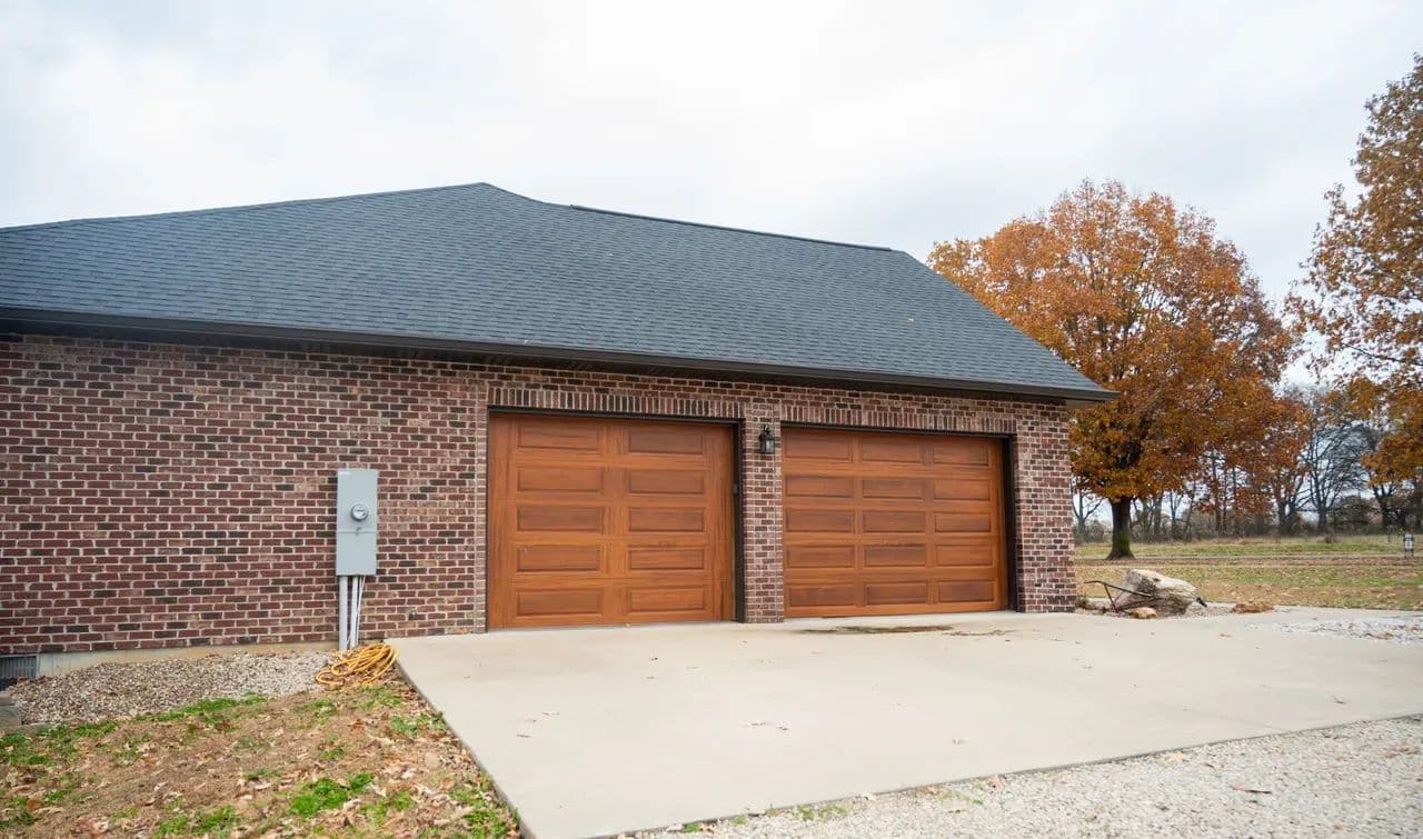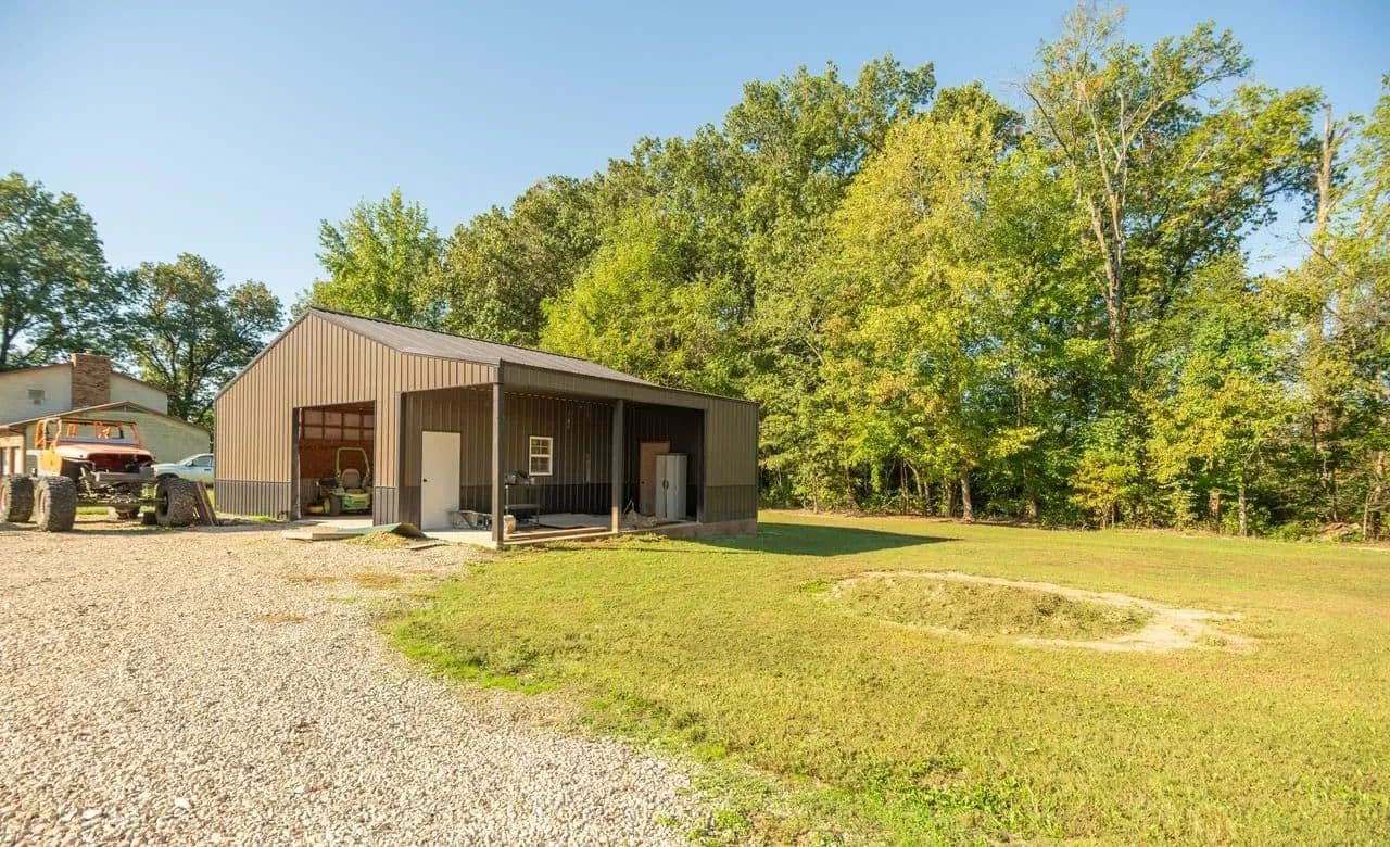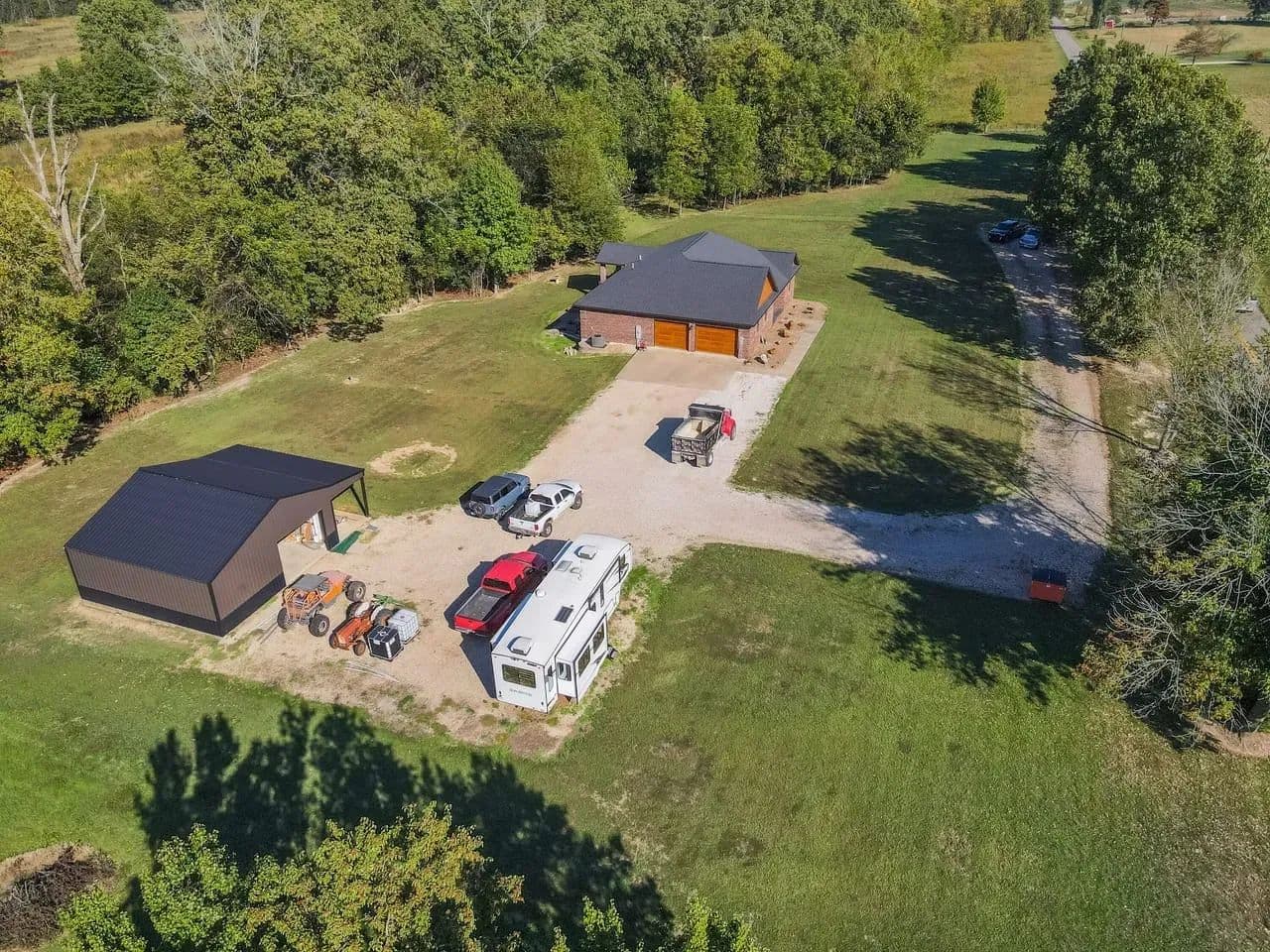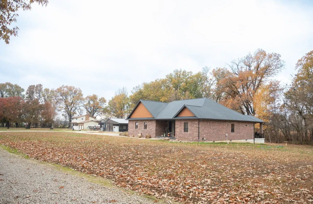 Custom brick and stone home on nearly 3 acres offering high-end finishes and rustic charm. Inside, the gourmet kitchen features Cambria quartz countertops, a copper farmhouse sink, maple-glazed cabinets, ledgestone pillars, and a full KitchenAid appliance suite. The home features two master suites, each with a cedar-framed bed, a walk-in closet, and hardwood floors. A spacious third bedroom, currently used as a study, and a versatile bonus room, ideal for storage or a nursery, provide additional flexibility. Both master suite bathrooms are beautifully finished with custom cabinetry, stone sinks, quartz countertops, and tiled showers. The living room offers a warm, rustic feel with a custom stone fireplace wrapped in cedar, vaulted ceilings with custom beams, and a knotty alder front door. Enjoy the outdoors with concrete front and back porches, a 30x30 shop with a 10x30 overhang, and an oversized two-car garage. Quality craftsmanship and thoughtful design make this home a standout property in a peaceful country setting.