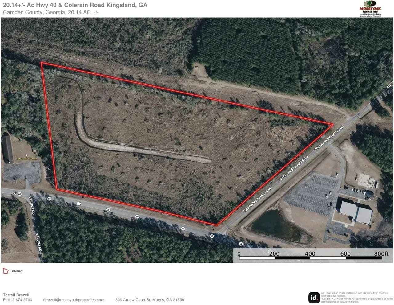 Well Located Commercial Corner on GA Hwy 40 and Laurel Island Parkway in Kingsland, GA. This 20.14 Ac Parcel has City Water and Sewer, Three Phase Power and Double Paved Road Frontage. Laurel Island Parkway has a planned 4 lane expansion which should increase the already strong traffic counts. It has a C-2 Zoning in the City of Kingsland and is an ideal location for a Gas Station, Retail Store, Commercial or Residential Development. 5.5 Miles to I-95 Exit 3. 5 Miles to Exit 6. 15 minutes to the main Gate of Naval Station Kings Bay. 30 minutes to the Jacksonville International Airport & River City Mall. Camden County & the City of Kingsland are Pro-Development and easy to work with to gain the desired zoning. For additional information contact Terrell Brazell at 912-674-2700 or