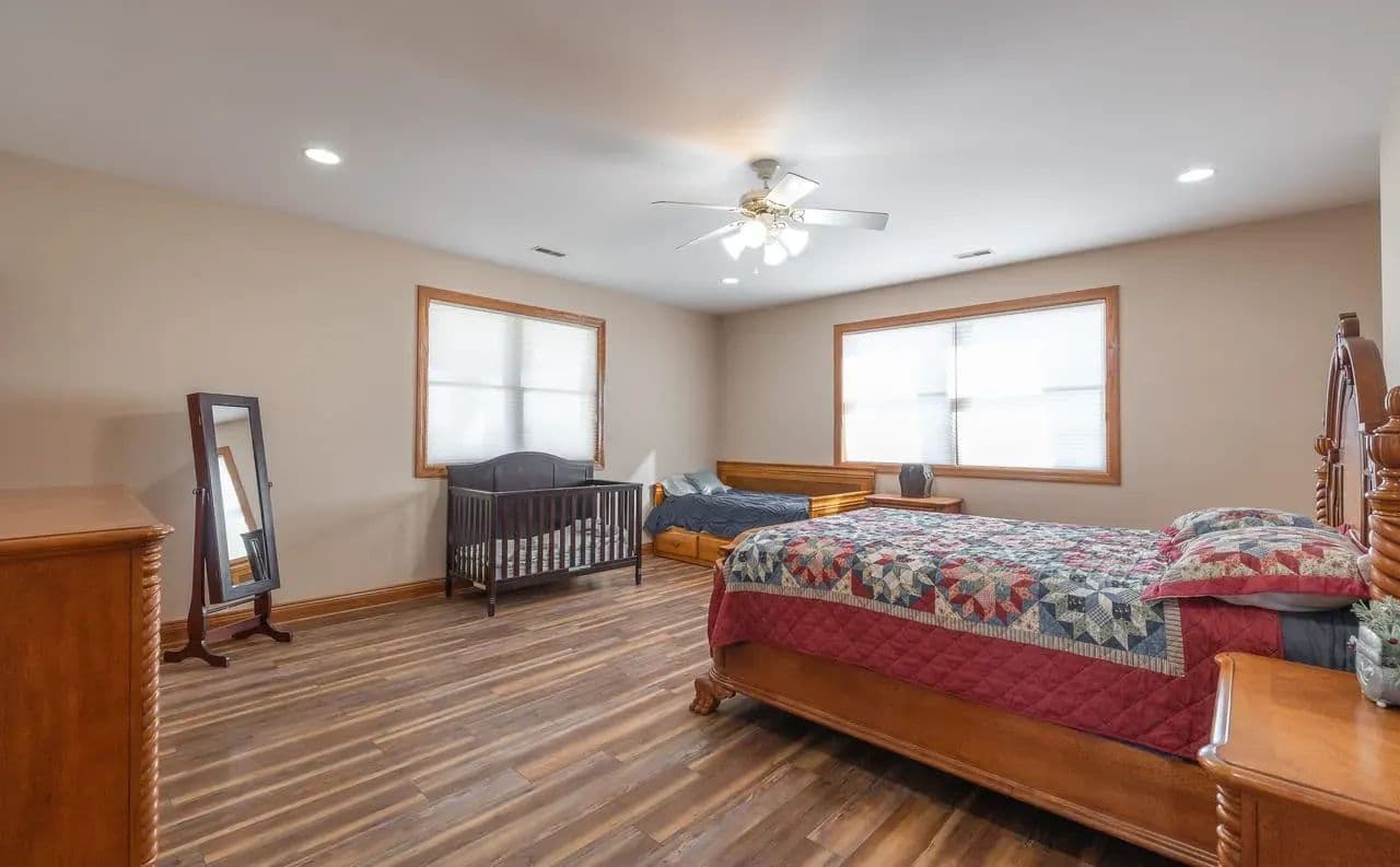 Fischer Farm and Ranch Estate – Turnkey, Multi-Use Property! This 122+ acre working farm combines productivity, comfort, and self-sufficiency. Designed for livestock, crops, and residential living, the property includes multiple water sources, extensive fencing, and high-quality improvements throughout. Land and Water Features: Two ponds, seasonal springs, and a year-round creek provide abundant water. Three wells, six automatic cattle waterers, welded wire perimeter fencing, and cross-fenced pastures make this property livestock-ready. Four pastures, including a smaller barnyard pasture, each have multiple water sources for easy rotational grazing. Vinyl fencing lines the road frontage and surrounds the main home. Concrete driveways provide easy access to barns and home, and a 1,000-gallon diesel tank services machinery. Barns and Outbuildings: • Main Barn (“Grandma’s Barn”) – Three apartments (two wheelchair-accessible, one caretaker) with full kitchens, baths, laminate floors, and individual heating/cooling. Common area includes laundaronia, and three types of seedless grapes. Main Residence: Brick home with 6 bedrooms plus 2 sleeping rooms and 8.5 baths. Main-floor primary suite, four upstairs bedroom suites, and three basement suites (two non-conforming). Each bedroom has a full bath and walk-in closet. Two kitchens and three laundry areas support multi-generational living or staff. Main kitchen includes Viking/Sub-Zero appliances, cherry cabinetry, large pantry, and breakfast bar. Professionally refinished oak floors, tiled entries, and laminate bedroom floors complete the home. Living areas include cathedral ceilings, gas fireplace, south-facing windows with remote blinds, and French doors to patios overlooking the 22,000-gallon fiberglass pool. Outdoor entertaining is enhanced by patios on three sides, overlooking pastures, ponds, and natural scenery. Infrastructure and Systems: Steel-stud construction, Anderson windows, central vacuum, conduit wiring, three geothermal HVAC systems (main replaced 2025), five 40-gallon water heaters plus on-demand unit for master bath. Solar power via 104 SolarEdge panels with net metering. Four 200-amp electrical panels (800 total amps), buried 1,900-gallon LP tank, and cellular booster ensure full functionality. Summary: A rare opportunity blending high-quality infrastructure, multi-generational housing, livestock-ready land, and sustainable features. Ideal for cattle, crops, or a full-time rural homestead with income potential. This property is fully equipped for productive living, comfort, and convenience. Schedule your private tour today to experience this one-of-a-kind farm and ranch estate!