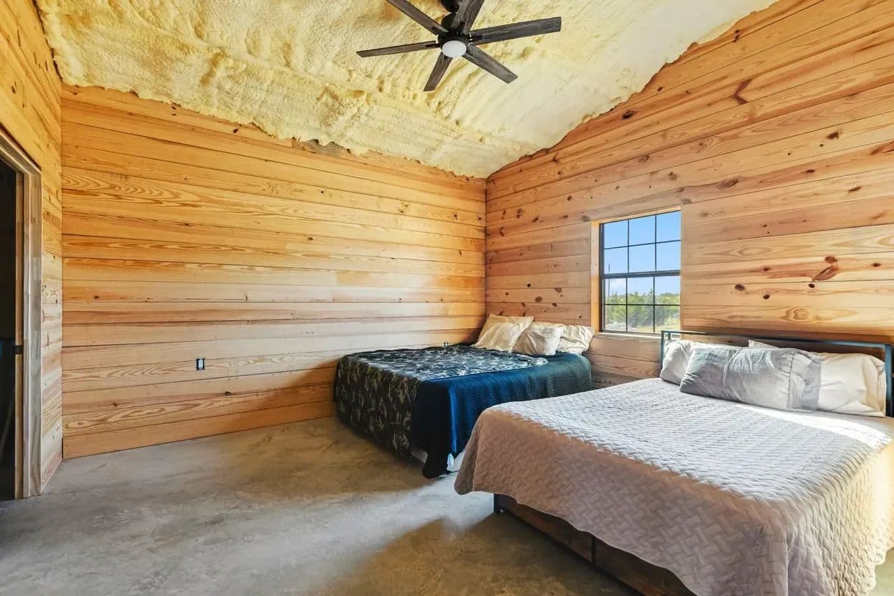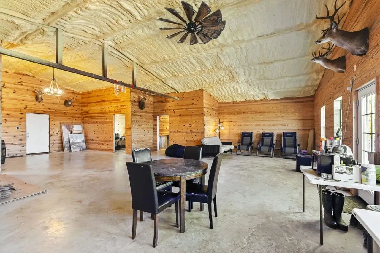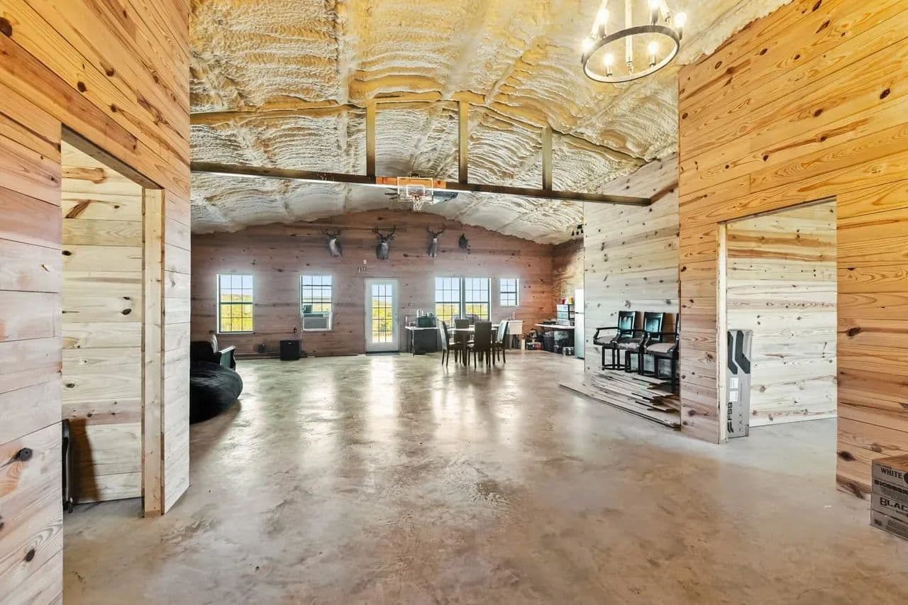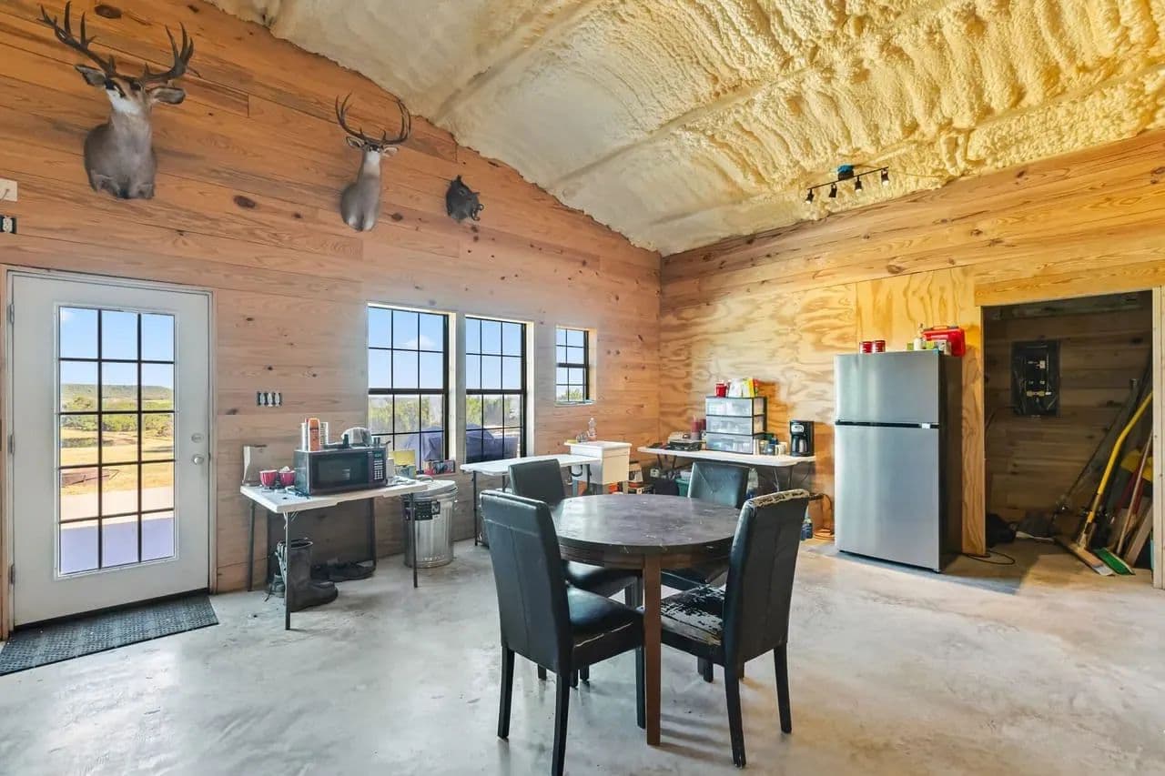 Improvements: A 40x40 barndominium sits at the front of the property that overlooks some views of large hills and ridgelines. The barndominium is approximately 60% complete but fully functional as it stands. Designed to be a 2 bed, 2bath with open kitchen & living concept. There is ample room to build out a third bedroom or to add on. Slab foundation with metal beams and closed cell spray foam insulation. The slab was extended to the side of the barndo for future covered parking or to add on. The back porch slab was also extended for ample room for whatever you may want at 60'x40'. The property is fenced on 3 sides with rear fencing to be in excellent condition. 2 deer blinds, 2 feeders, and 2 protien feeders.