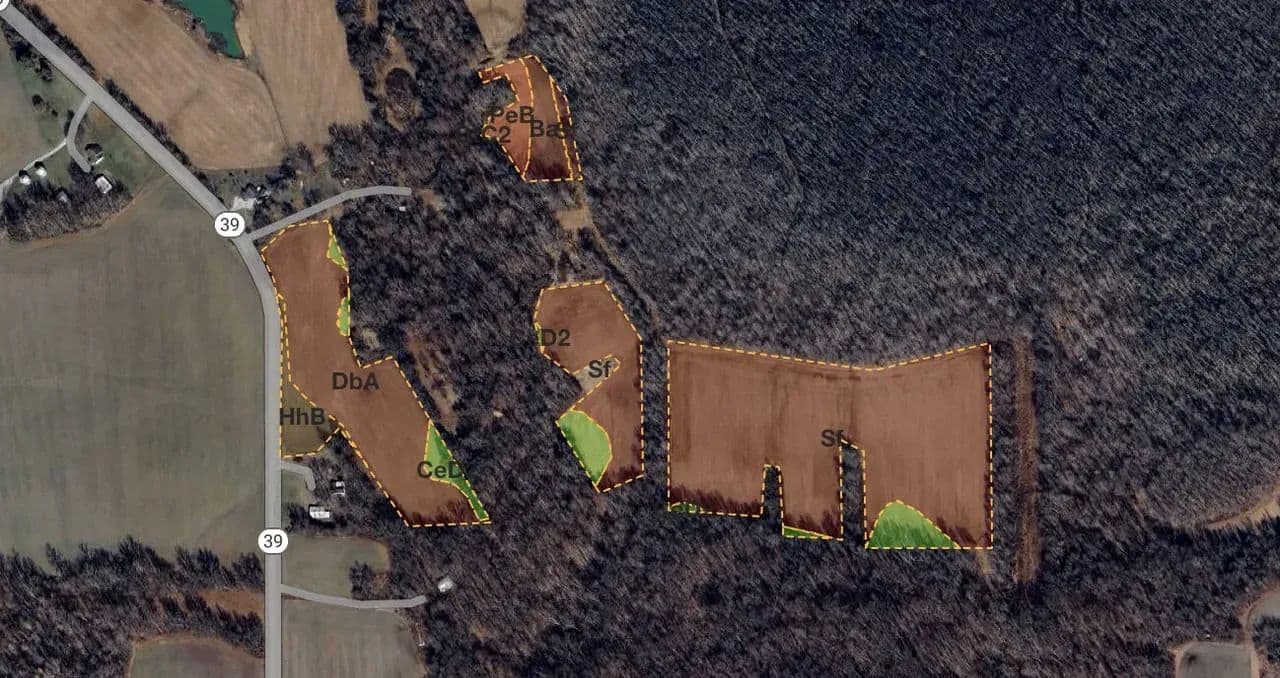 The lease premises are located in eastern Washington County, Indiana, along Indiana Highway 39, consisting of approximately 23 tillable acres available for agricultural use. The Lease term shall be five (5) years, commencing on March 1, 2026. The property is divided into four (4) fields, each with a dedicated access lane to allow safe ingress and egress of farm equipment. Most access lanes are in good condition; however, a few areas will require maintenance during the first year of the lease. With an average NCCPI rating of 71.8, the soils are well-suited for row-crop production and are expected to provide consistent yields of both corn and soybeans under proper management. No hunting, fishing, or other recreational rights are included in this lease. The Lessee (farmer) shall be responsible for the upkeep and routine maintenance of all fields and access lanes, including bush-hogging, removal of fallen trees or debris, and keeping access routes passable at their own expense.