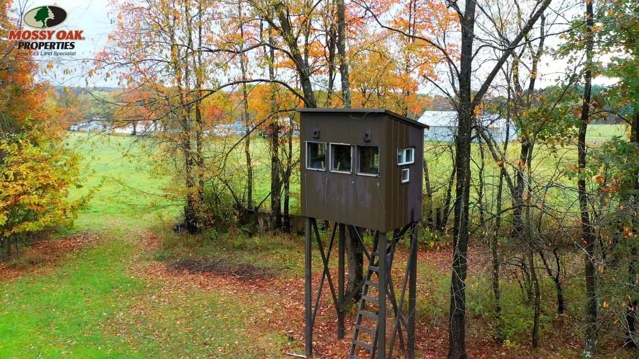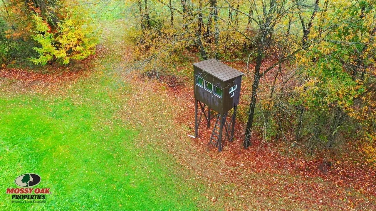 The land features two open fields — one over 5 acres on the northwest corner and another over 8 acres on the northeast — currently leased for hay production, offering immediate income potential. Nestled among the mature, unharvested timber is a 1-acre food plot thoughtfully planted with chestnuts and fruit trees to attract wildlife. A custom-built hunting blind overlooks the area, ideal for observing or harvesting the mature whitetail deer this property consistently produces.