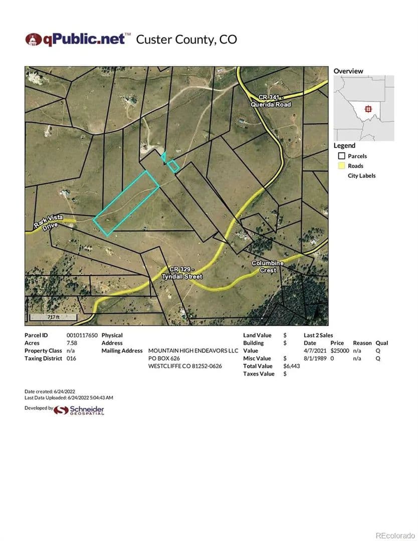 This one of a kind 7.5-acre lot offers extraordinary views of the 360-degree variety including Pikes Peak, Mt. Tyndall and vast rolling hills in the foreground with the legendary Sangre de Cristo range as the backdrop and wide-open meadows to enjoy year around. The property views are truly unblockable for future development. Enjoy your peace of mind and serenity knowing that your surroundings will never be compromised by additional development. Recent $18K in the excavation of the driveway and generous sized pad that can accommodate a custom home - all waiting for your vision of living the mountain lifestyle that is becoming harder to obtain at this level. Take a short drive off Highway 96 near the town of Westcliffe to CR 341 and let the planning begin. You will not be disappointed! From Westcliffe, head east on State Highway 96, turn right (south) onto County Road 341. Go approximately 2.1 miles then make a right turn, stay left at the Y and the property is approximately 1/2 mile up on the left.