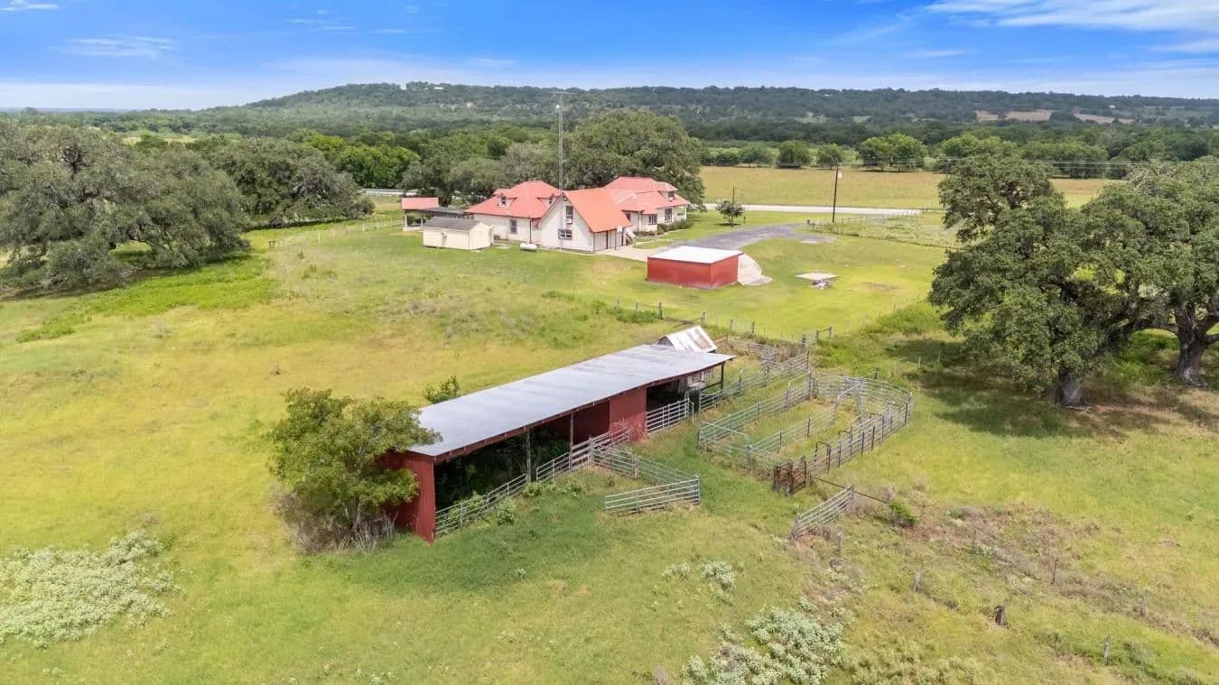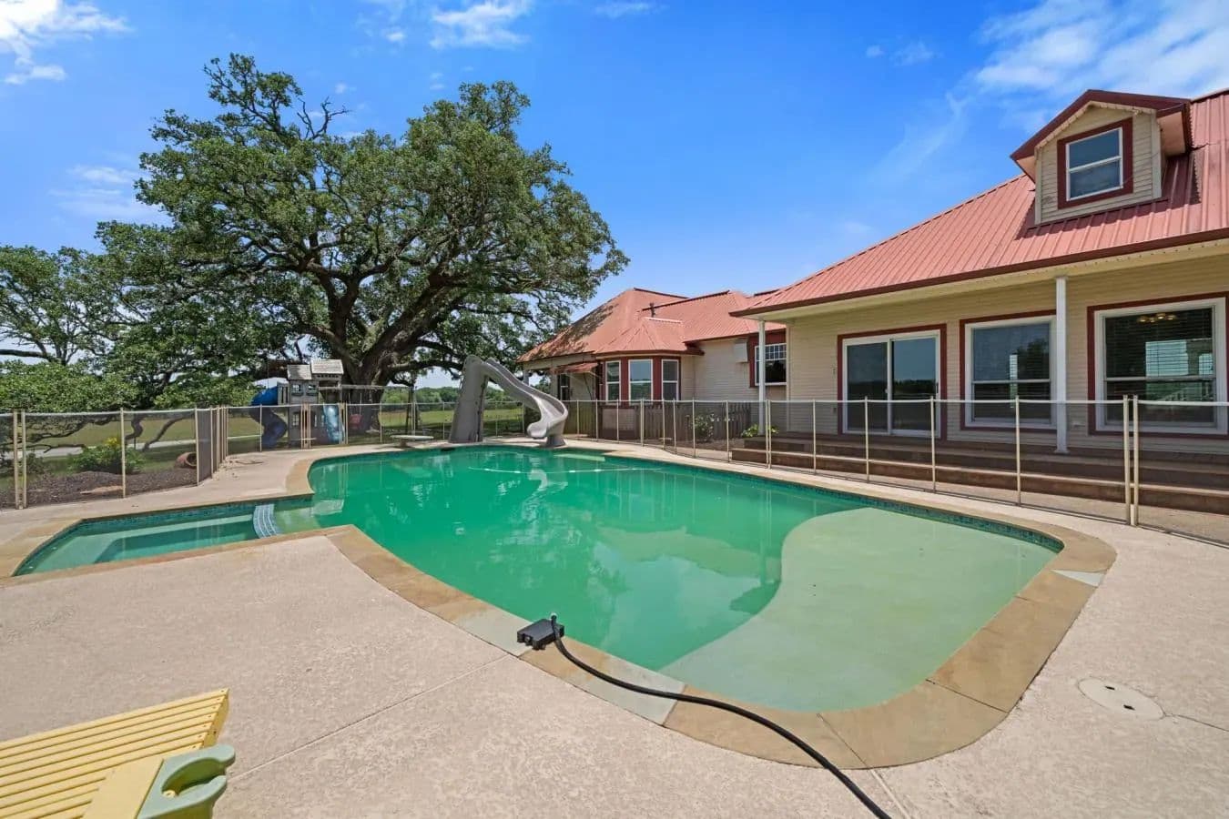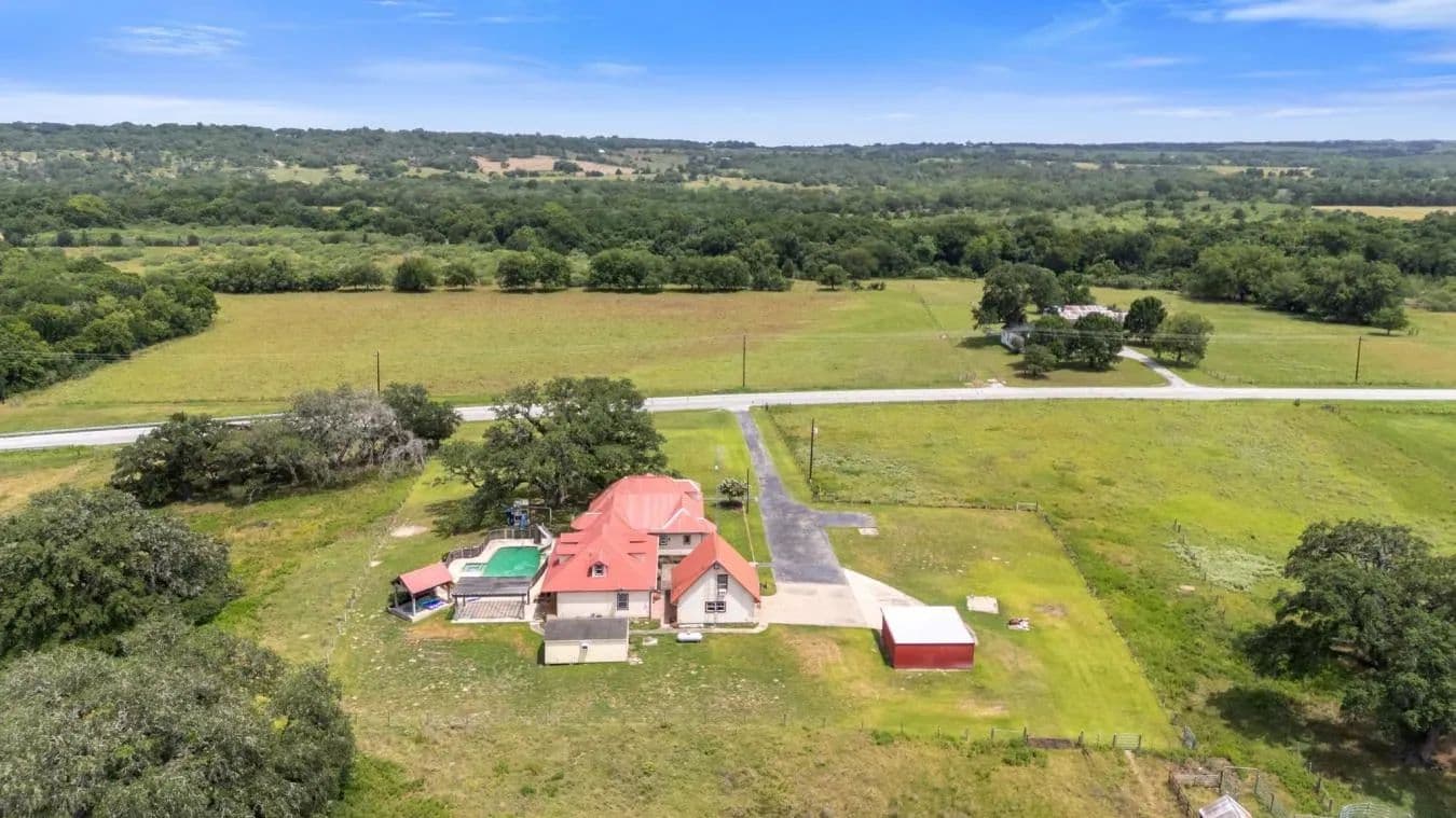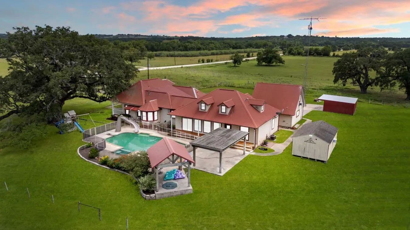 Welcome to 2610 FM 609! Your dream farmhouse on 56 breathtaking acres! This beautiful 3,336 sq ft, 1 1/2-story farmhouse blends classic charm with modern comfort, featuring 3 spacious bedrooms (1 suite upstairs), alongside 4 1/2 bathrooms, and two living areas. Enjoy a large covered patio and a sparkling pool, ideal for relaxing or hosting gatherings. The detached 2-car garage includes a guest suite with its balcony, offering additional space for guests, or a private retreat. Interior highlights include granite countertops, a large kitchen island, elegant laminate and carpet flooring, and a stunning primary suite with a luxurious ensuite bath. The open kitchen, dining, and breakfast areas create a seamless flow throughout the home. The expansive acreage includes pastures, hay fields, horse stables, and storage sheds-ideal for equestrian or country living. Don't miss this rare opportunity to own a fully equipped Texas farmhouse estate. Schedule your private showing today!