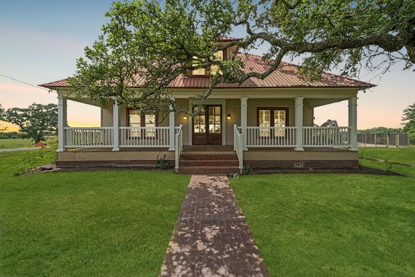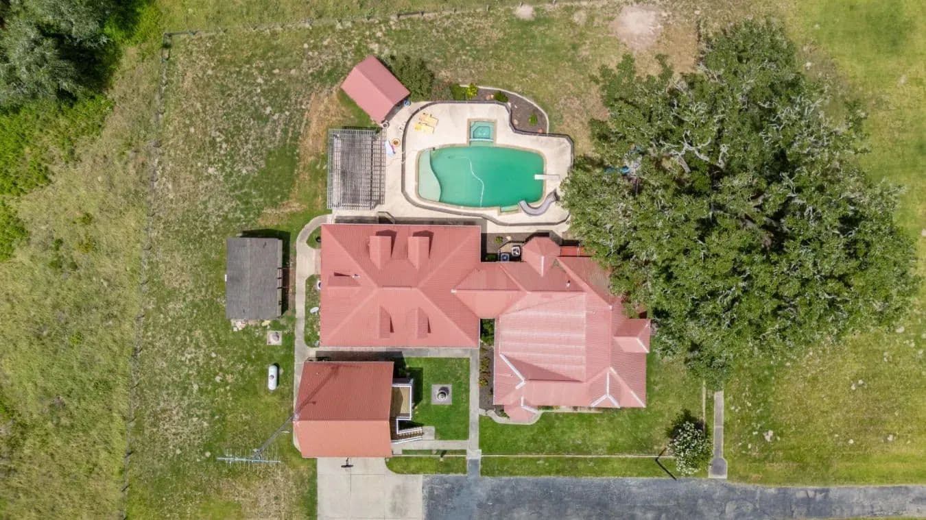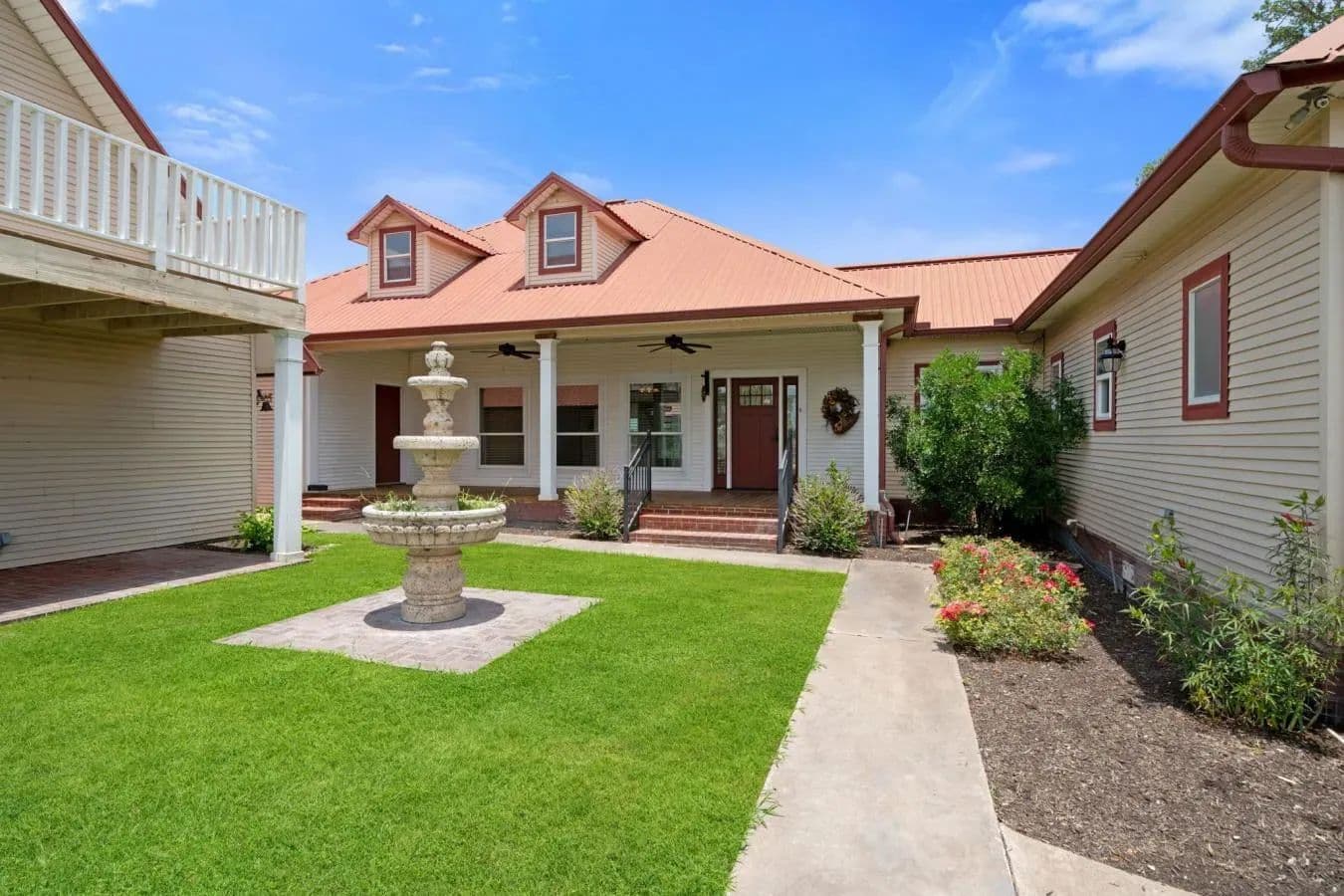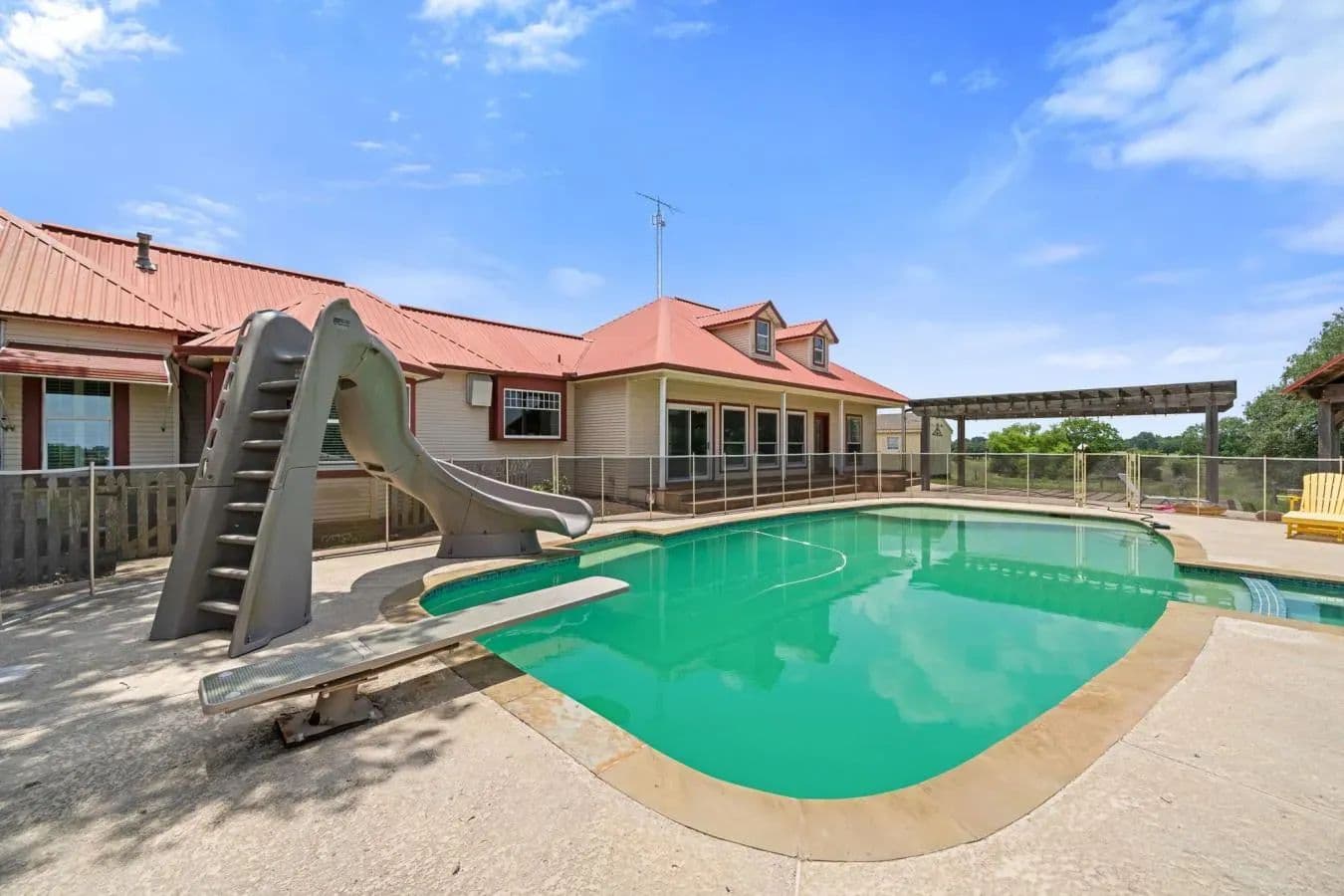 Welcome to 2610 FM 609! Your dream farmhouse on 56 breathtaking acres! This beautiful 3,336 sq ft, 1 1/2-story farmhouse blends classic charm with modern comfort, featuring 3 spacious bedrooms (1 suite upstairs), alongside 4 1/2 bathrooms, and two living areas. Enjoy a large covered patio and a sparkling pool, ideal for relaxing or hosting gatherings. The detached 2-car garage includes a guest suite with its balcony, offering additional space for guests, or a private retreat. Interior highlights include granite countertops, a large kitchen island, elegant laminate and carpet flooring, and a stunning primary suite with a luxurious ensuite bath. The open kitchen, dining, and breakfast areas create a seamless flow throughout the home. The expansive acreage includes pastures, hay fields, horse stables, and storage sheds-ideal for equestrian or country living. Don't miss this rare opportunity to own a fully equipped Texas farmhouse estate. Schedule your private showing today!