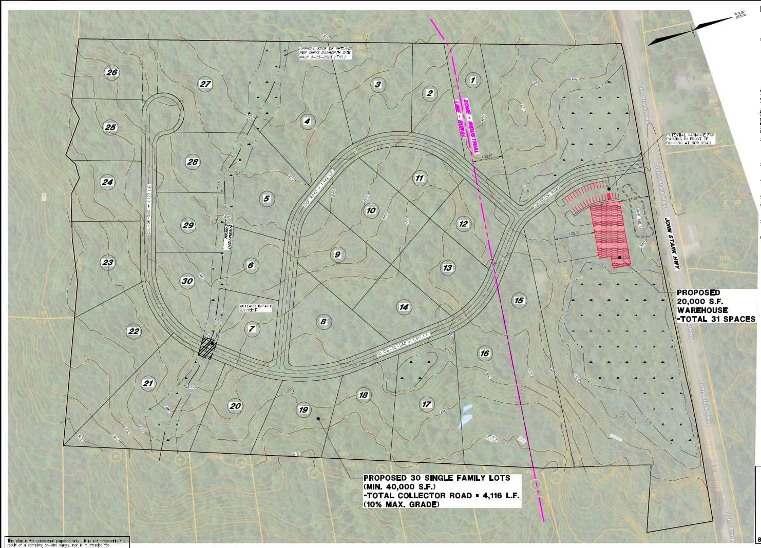 Presenting a rare 64 acre development opportunity offering both industrial and residential potential in one contiguous site. The front 400 feet of the property are zoned IND-1, allowing for commercial or light manufacturing uses, while the remaining acreage is zoned Rural Residential, ideal for a new housing subdivision or estate lots. Preliminary concept plans prepared by a local engineering firm indicate the site could support a 20,000 SF industrial building at the front portion, along with approximately 30 single-family homes throughout the balance of the property (subject to approvals). This property offers a highly flexible layout, allowing developers, investors, or end users to pursue a range of uses - from a mixed-use industrial/residential project to a standalone subdivision or business park. With significant frontage, strong zoning diversity, and large acreage, this site presents a unique opportunity to capture both commercial and residential demand in the area.