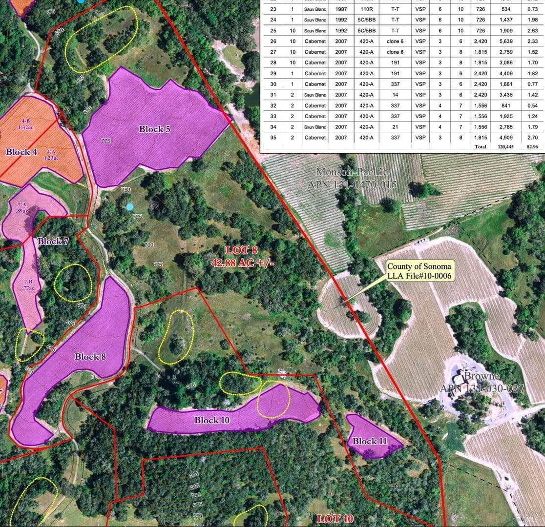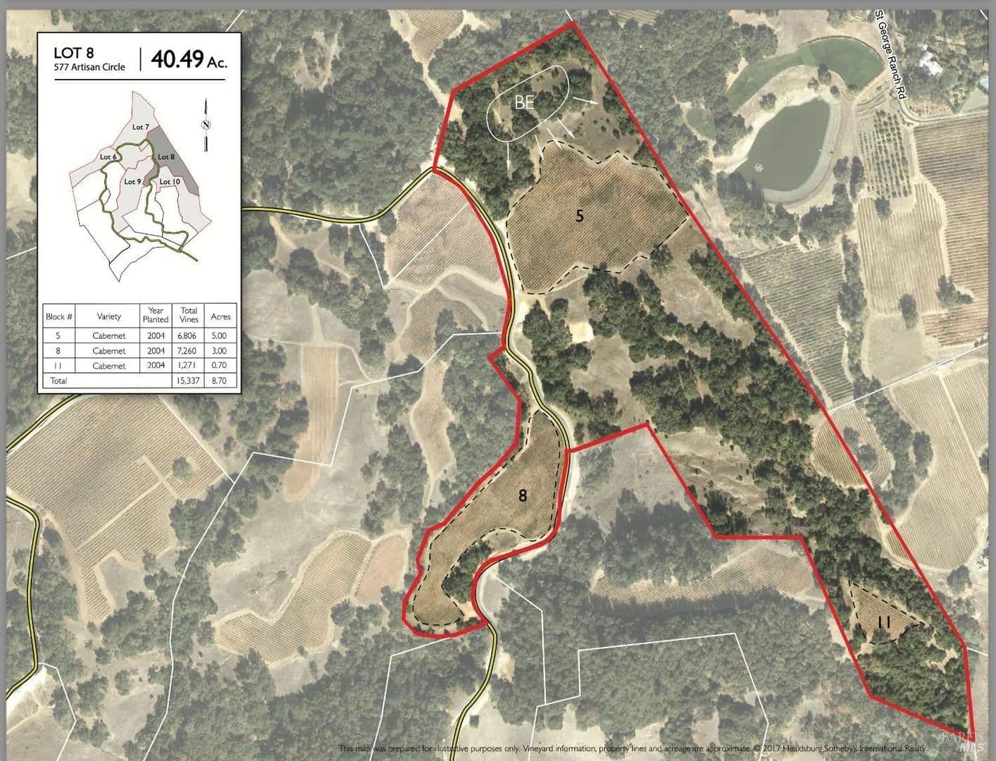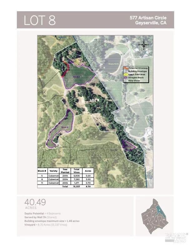 Introducing Boulder Meadow Ranch Properties, an exquisite collection of premier panoramic estate view building sites nestled in the heart of Alexander Valley. Sonoma Magazine names Alexander Valley among best places to visit in 2025. With over 166 acres spanning Lots 6, 7, 8, and 9, this sanctuary offers modern amenities including power, water, and percolation, alongside paved roads throughout the Ranch for ease of access. Enjoy the exclusivity and serenity of the Hall Ranch AV Homeowner Association, while marveling at the private vistas overlooking Healdsburg, Jimtown, and Geyserville. Embrace a lifestyle of luxury and tranquility amidst lush meadows and majestic boulders, each with multiple vineyard blocks, all within reach of Sonoma County's renowned wineries and cultural attractions. Sale subject to seller vineyard lease. Lot 8 - 42.88 +/- Acres Block 5 - 5 acres of Cabernet Sauvignon, Block 8 - 3 Acres of Cabernet Sauvignon., Block 11 - .7 acres of Cabernet Sauvignon.