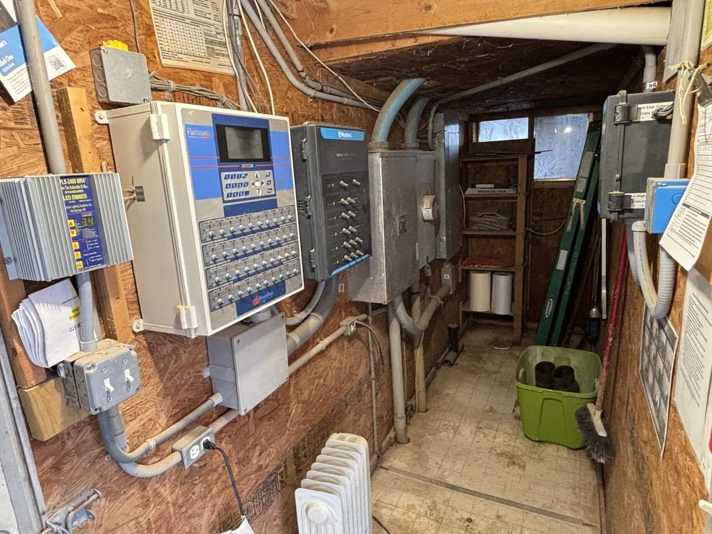 The poultry houses are equipped with Rotem Platinum Plus controllers with CPU cards updated in 2022, a Rotem alarm system, brooders, Valco drinkers, Cumberland E feeders, solid side walls, and Turbo Growers mounted on a winch system. The lighting has been updated to LED, and the farm uses city water and LP gas. A freezer is in place for mortality management.
