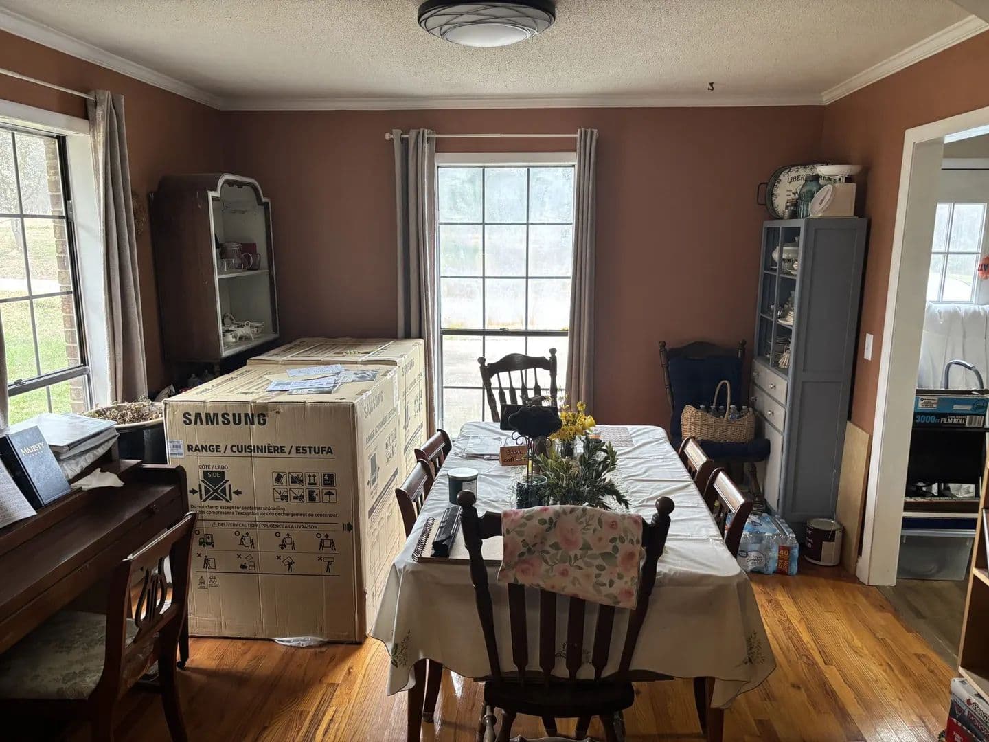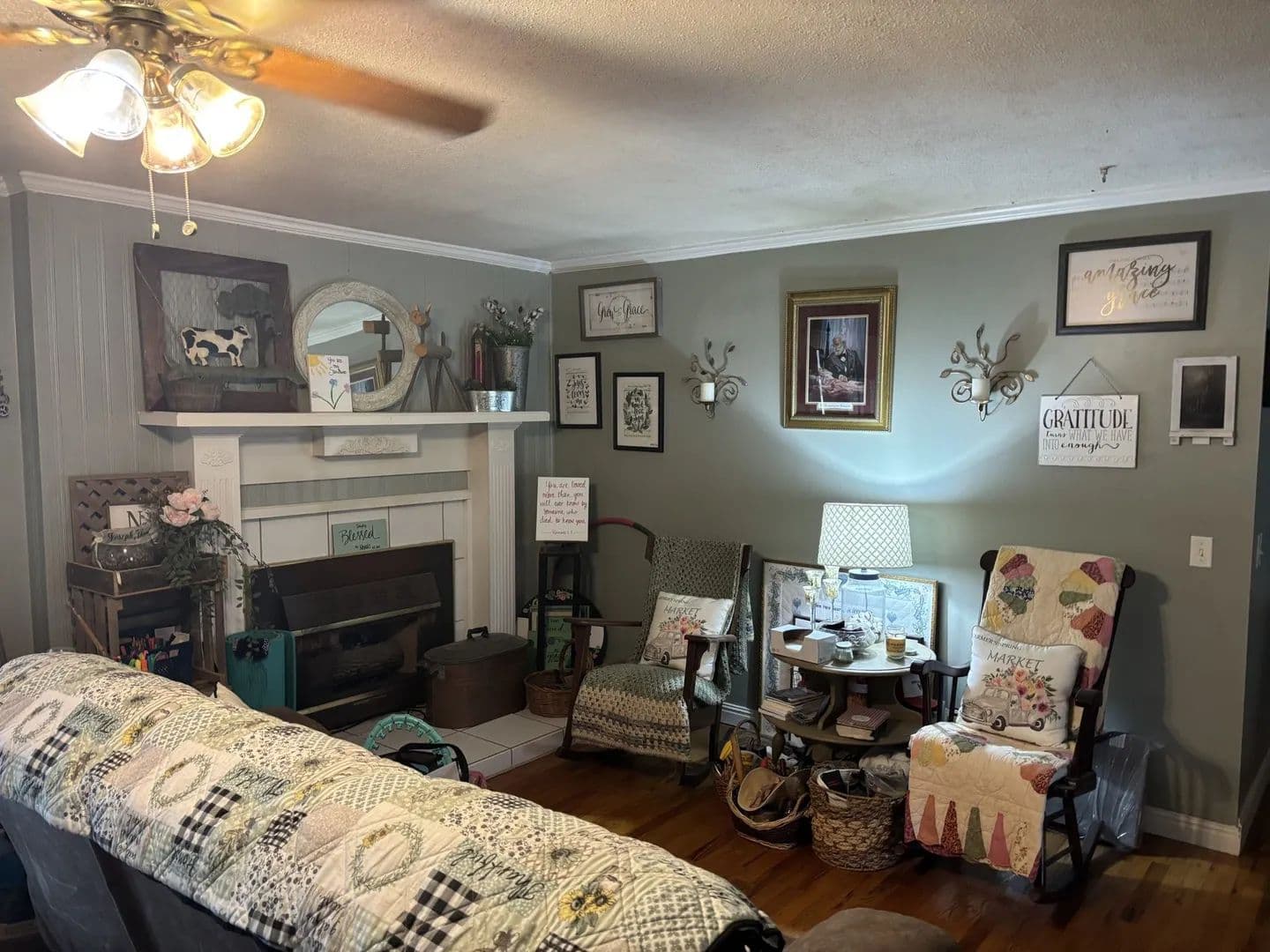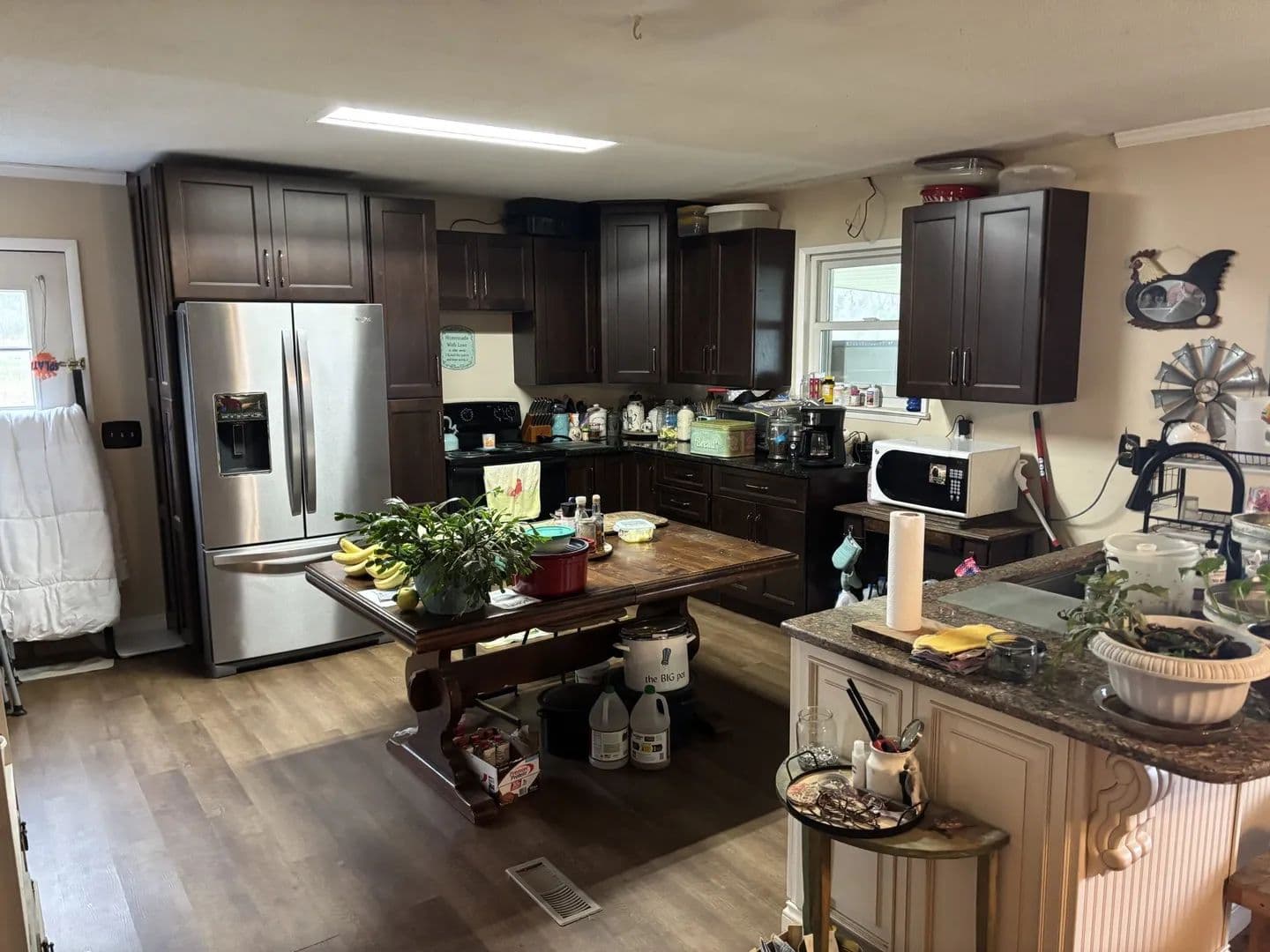 The residential home on the property is a brick house with three bedrooms, two bathrooms, and an unfinished basement. The kitchen features granite countertops, an island, and updated cabinets. The home is climate-controlled with HVAC and a central air unit.
