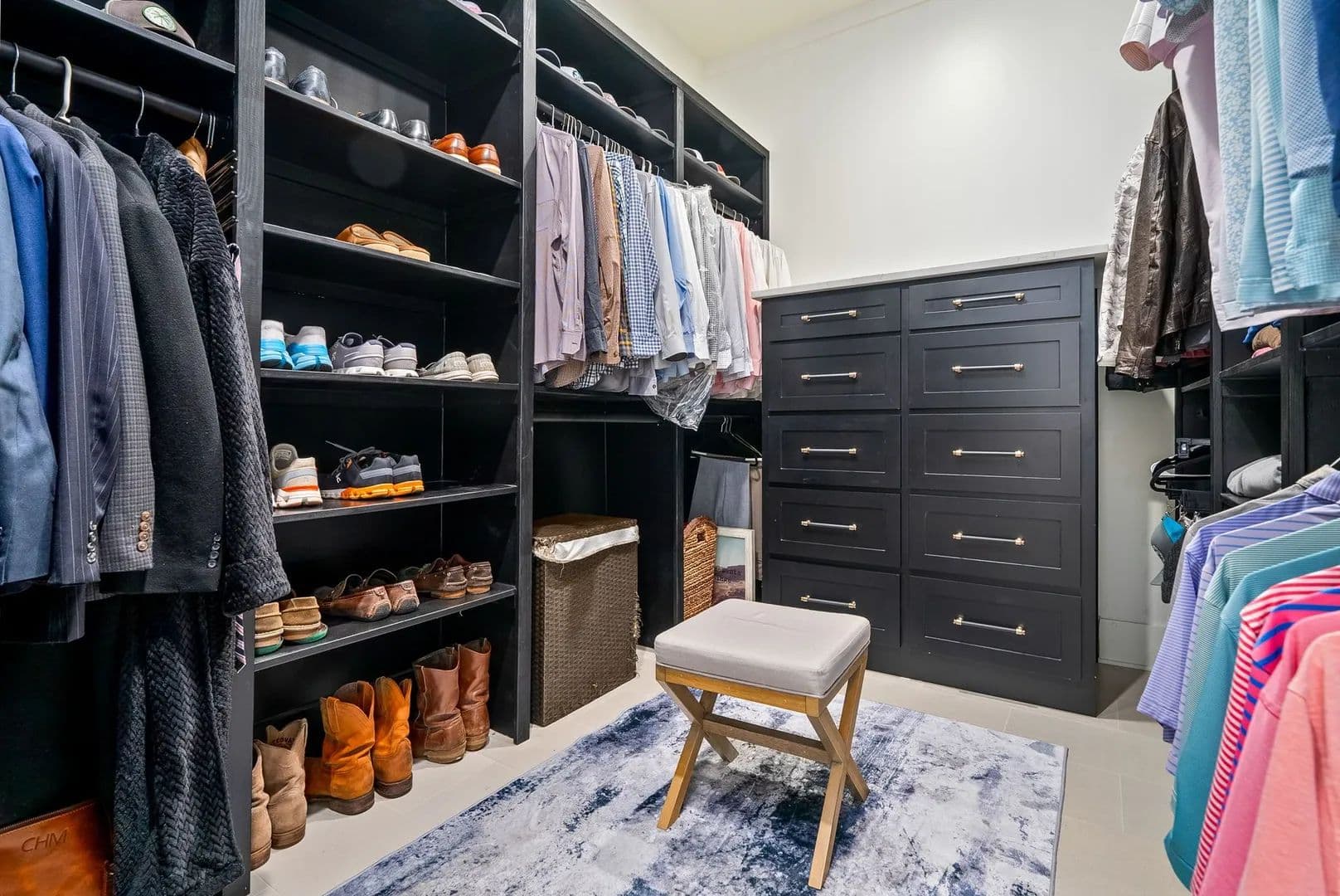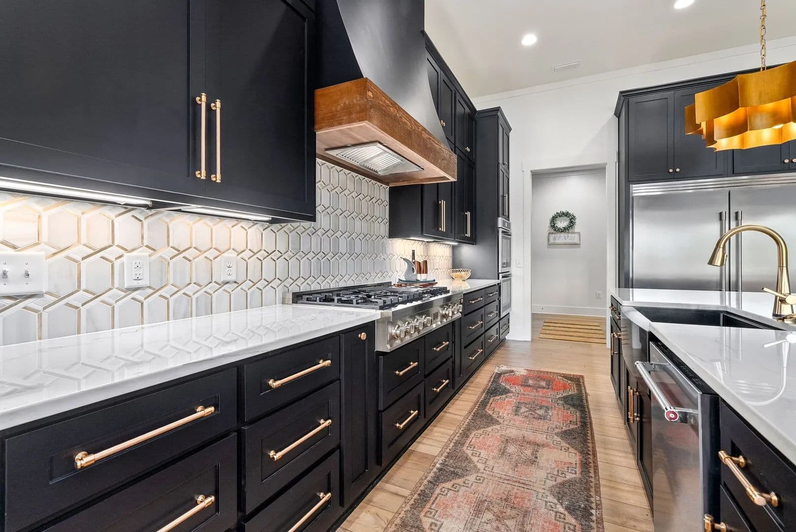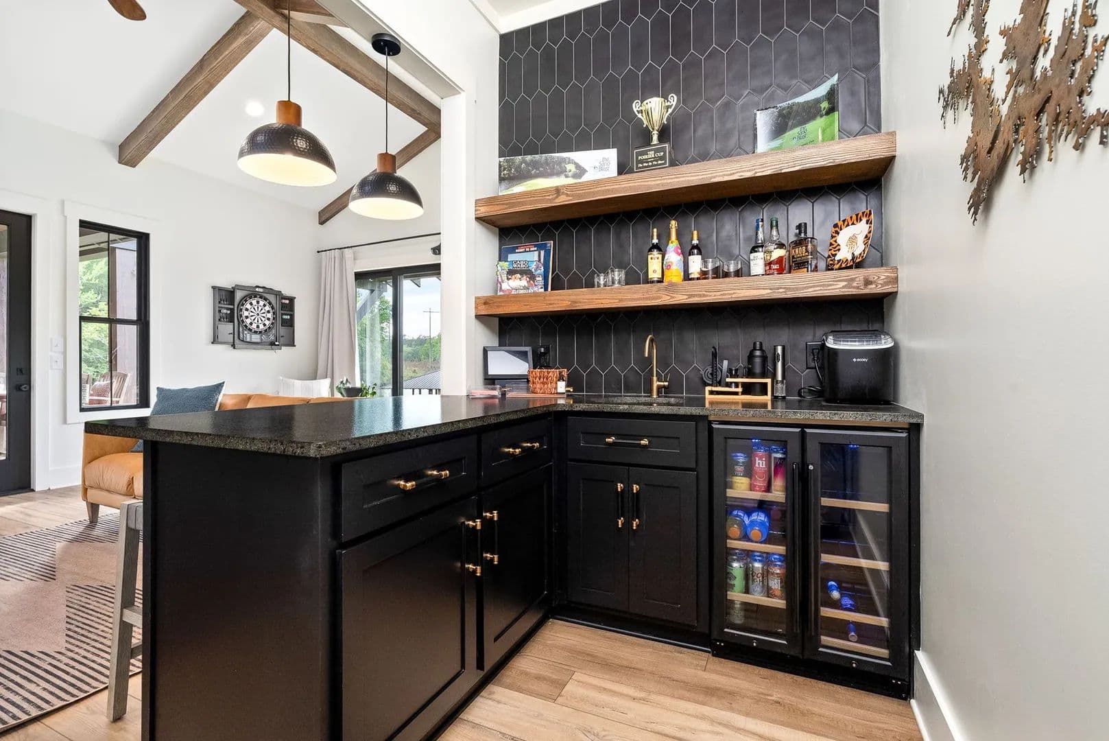The gourmet kitchen showcases exquisite quartzite countertops and flows seamlessly into two expansive living areas with vaulted ceilings. A full wet bar enhances the home’s entertainment capabilities, while the primary suite offers a spa-like retreat complete with a steam shower and dual custom walk-in closets.