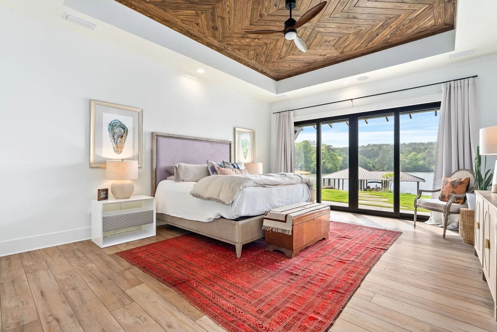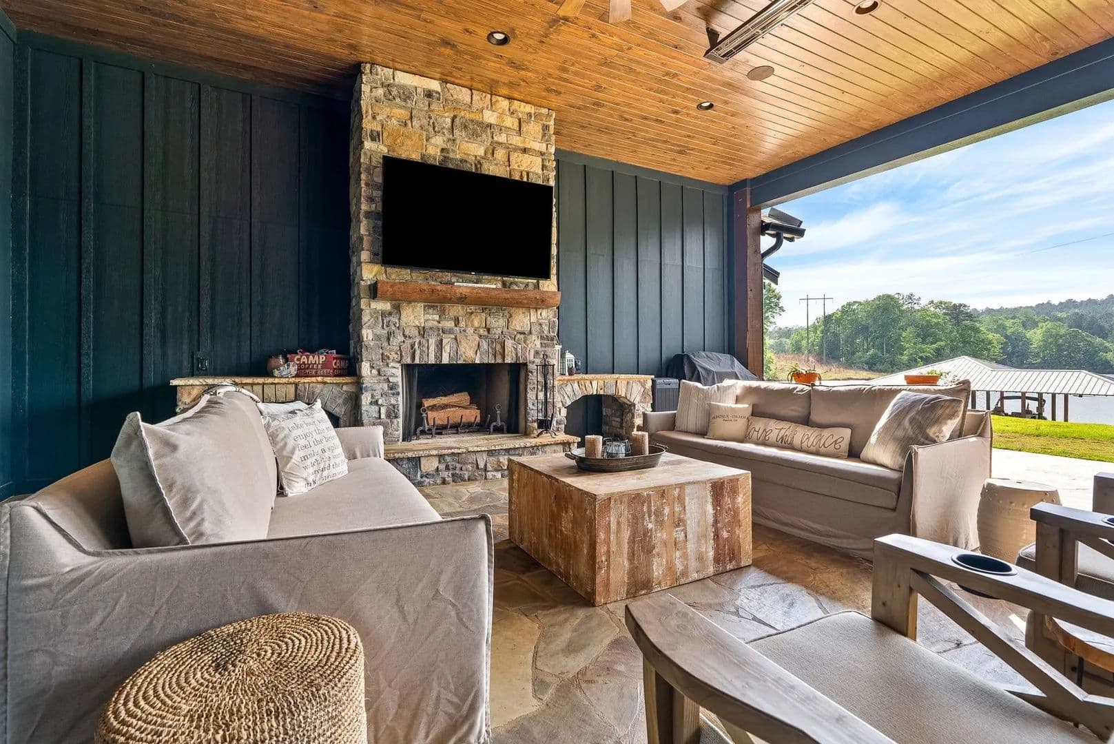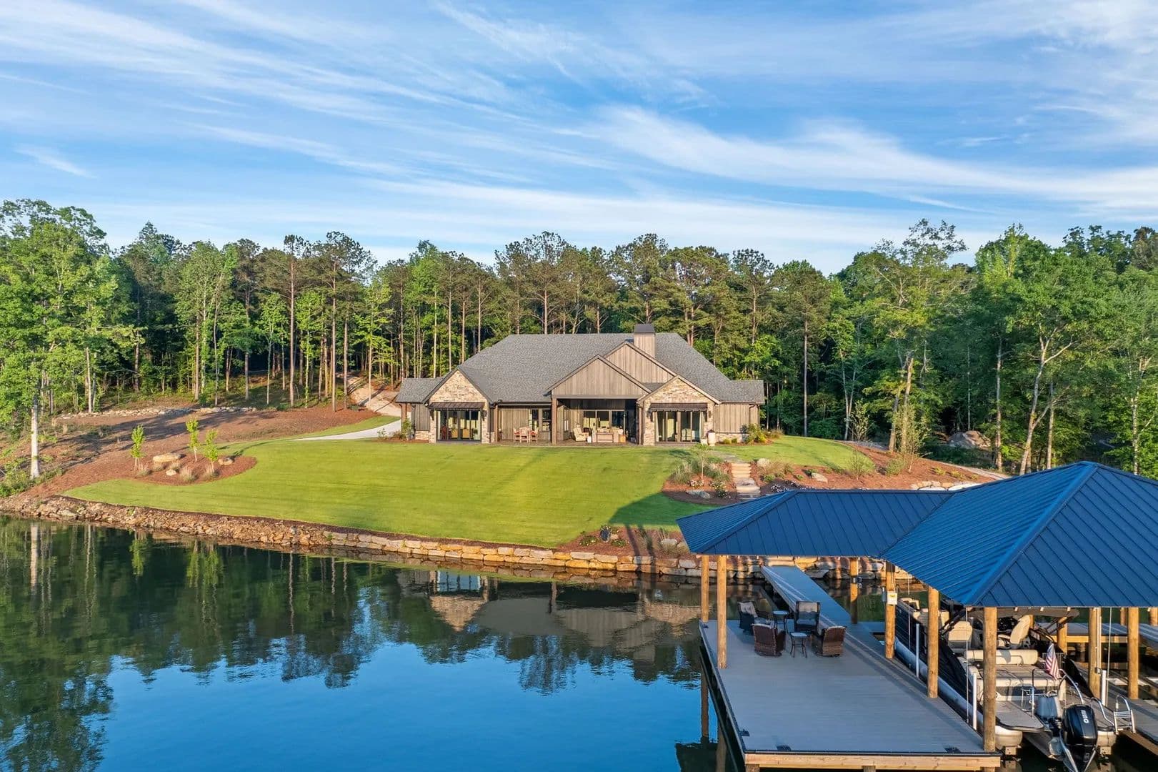 Outdoor living is equally impressive, with a covered porch equipped with infrared heaters and a wood-burning fireplace, professionally landscaped grounds with an irrigation system, and a covered double-slip dock featuring Trex decking and lifts for both a tritoon and jet skis.
