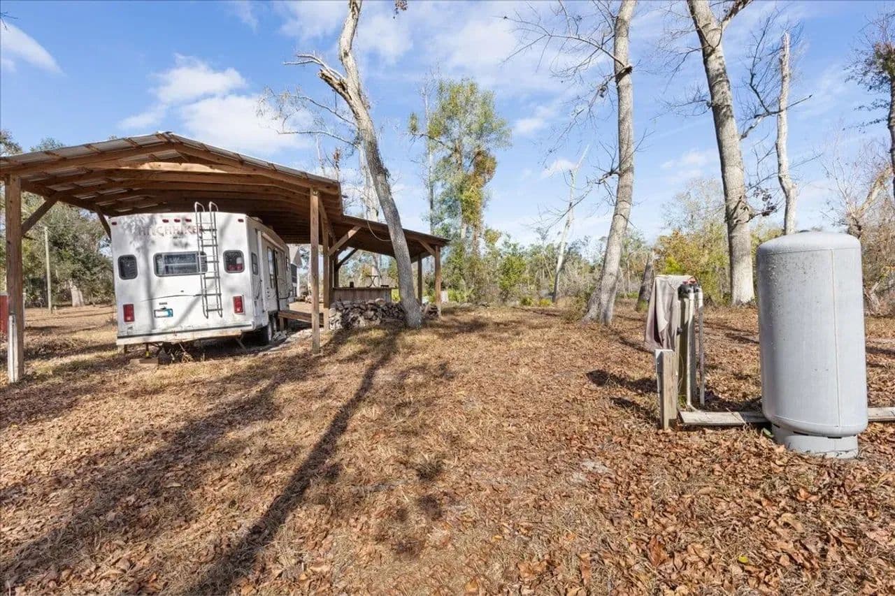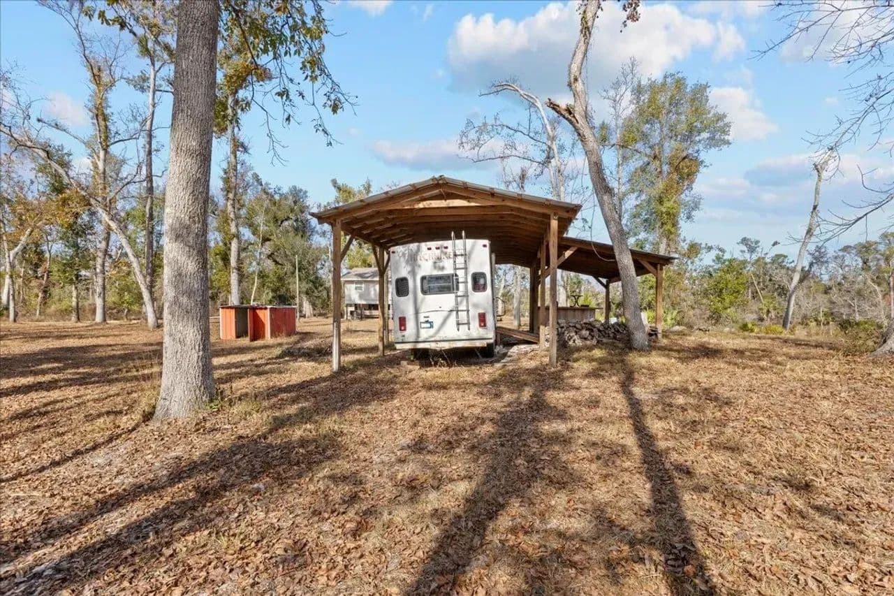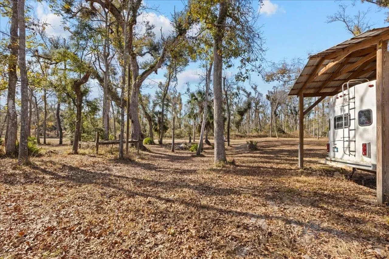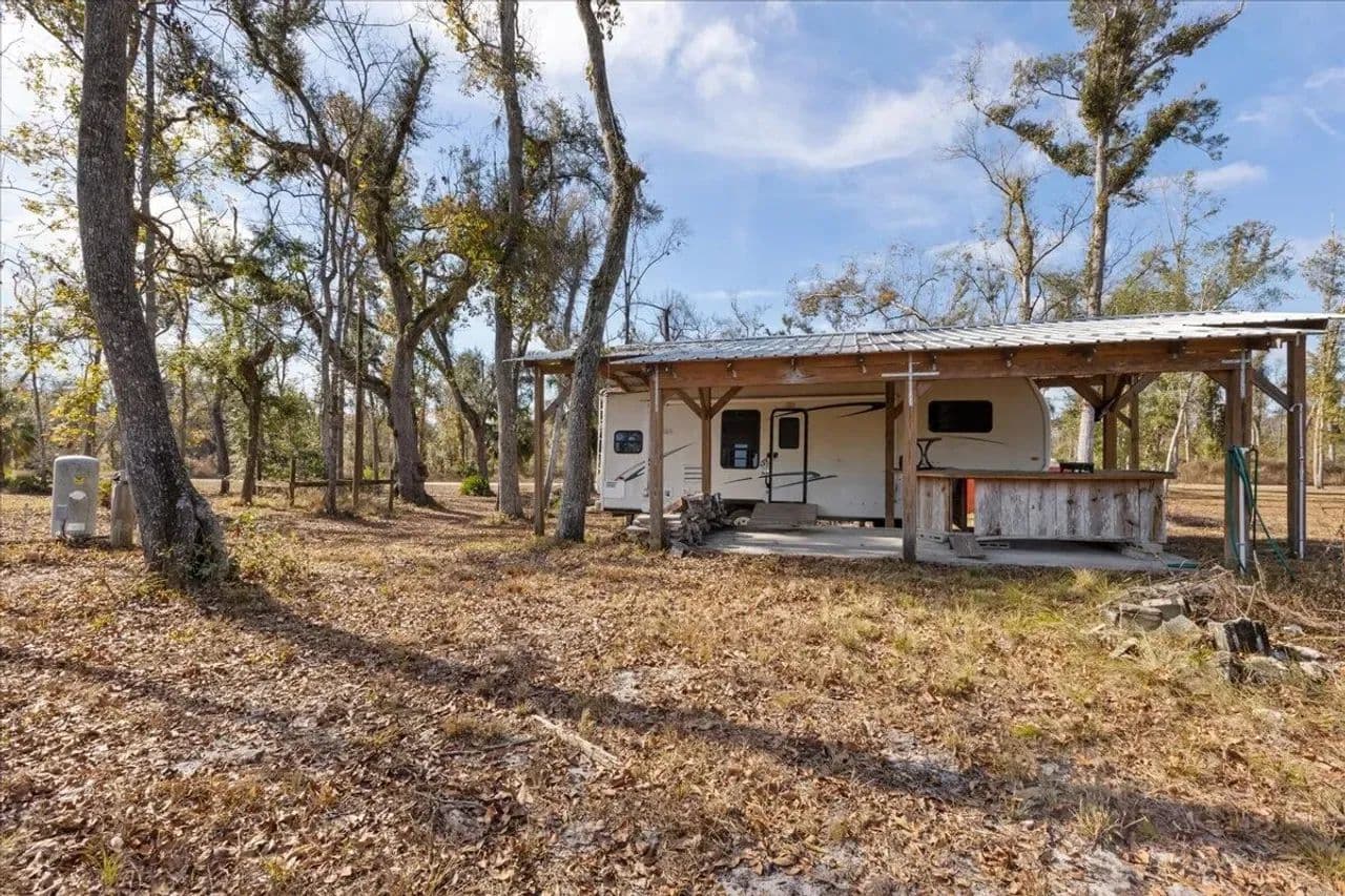 The property includes a dedicated camper shelter with a 5th wheel camper included, providing a turnkey setup for immediate enjoyment. Fish and boat right from your doorstep, with the Suwannee River offering excellent recreation year-round.