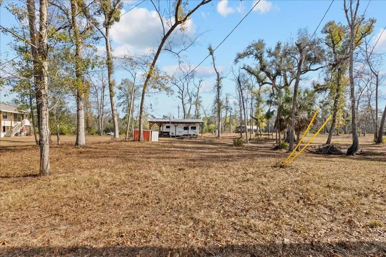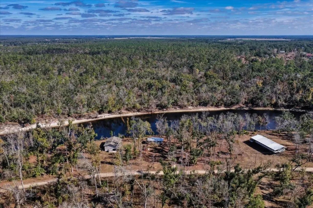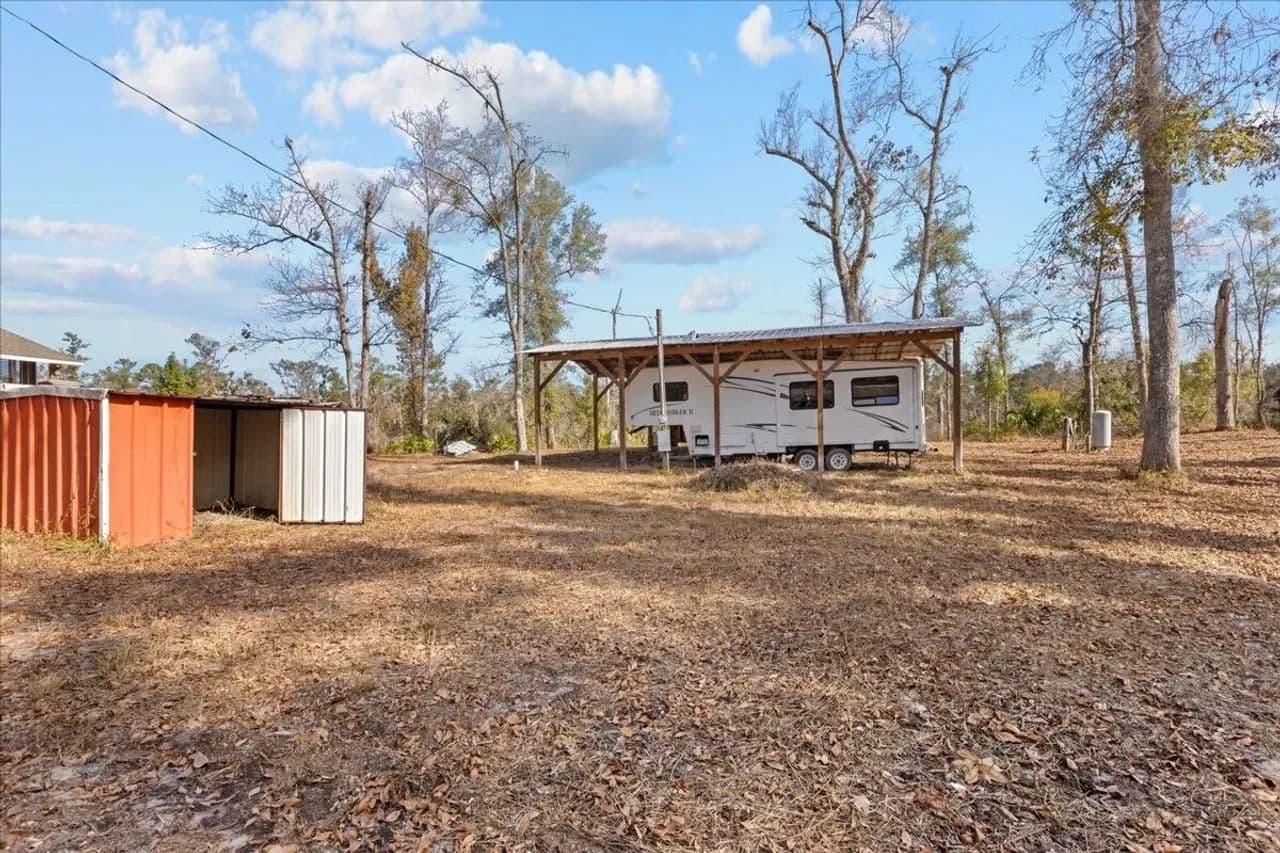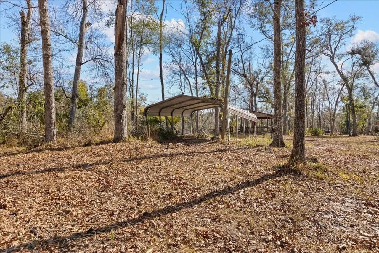 The property includes a dedicated camper shelter with a 5th wheel camper included, providing a turnkey setup for immediate enjoyment. Fish and boat right from your doorstep, with the Suwannee River offering excellent recreation year-round.